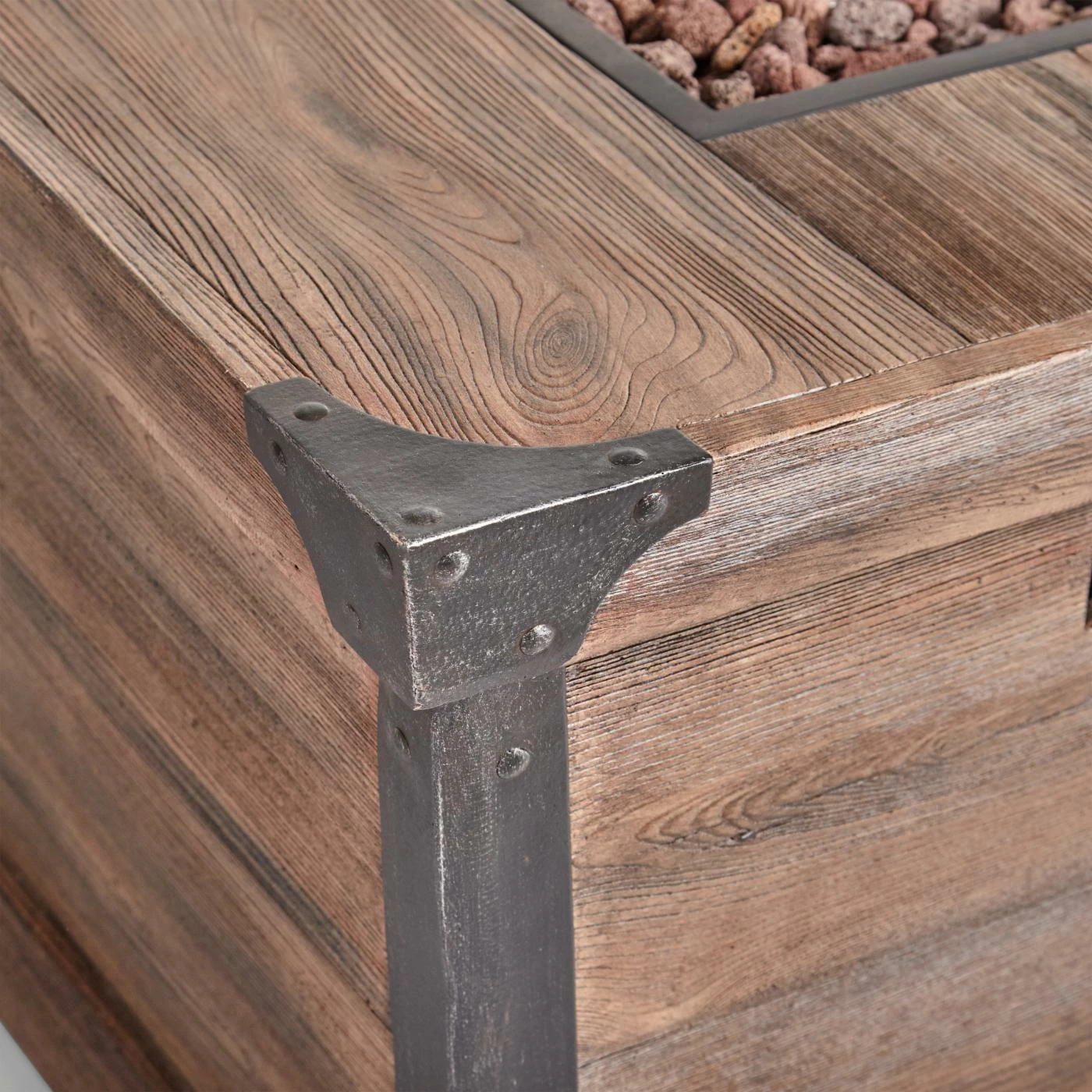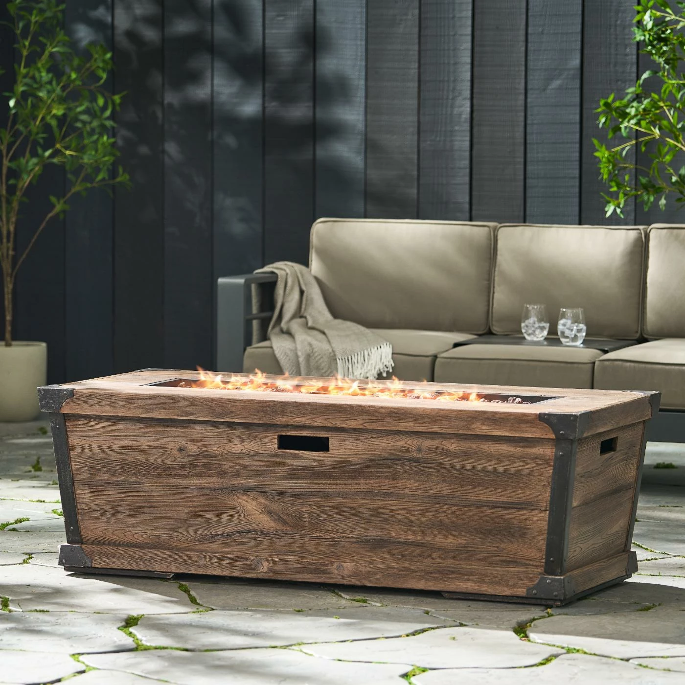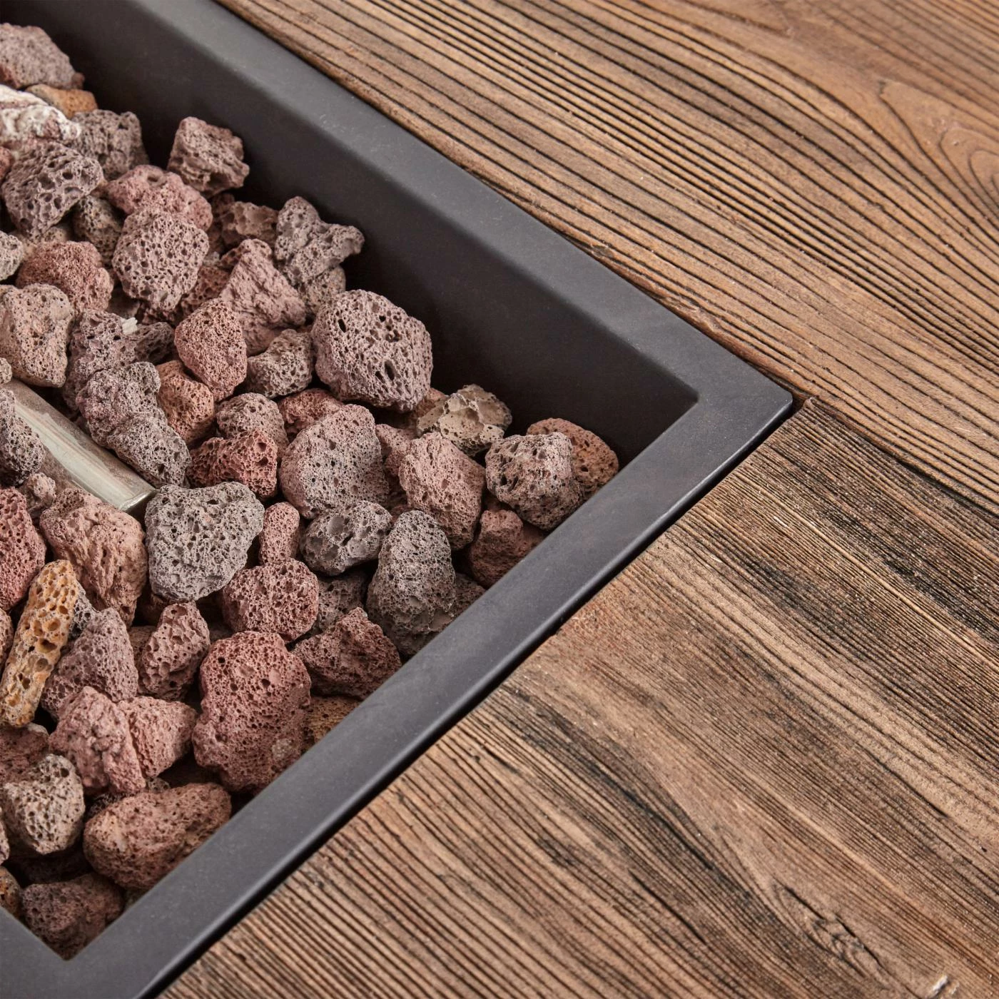 Embrace wood grain textures and rustic charms with this delightful accessory. With 50,000 BTU and a lightweight concrete build featuring a wood-like finish, our propane gas fire pit not only offers an incredible upgrade in style but is also perfect for parties due to its easy seating arrangement. From intimate conversations around a cozy fire to stargazing on cool summer nights, our rectangular fire pit will have no trouble gathering everyone together for hours of quality time. Please note that tank holder is NOT included.
