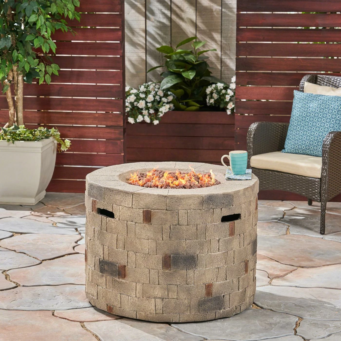 Envelope your patio space with a warm glow and subtle style to bring your friends and family together for a night of entertainment. With a built-in tank holder and stone-like exterior, our outstanding fire pit not only saves space with its charming design but also casts a homey atmosphere across your outdoor space. This piece is perfect for summer night gatherings with its easy seating arrangement and stunning style, making every starry night perfect for lounging with your loved ones.