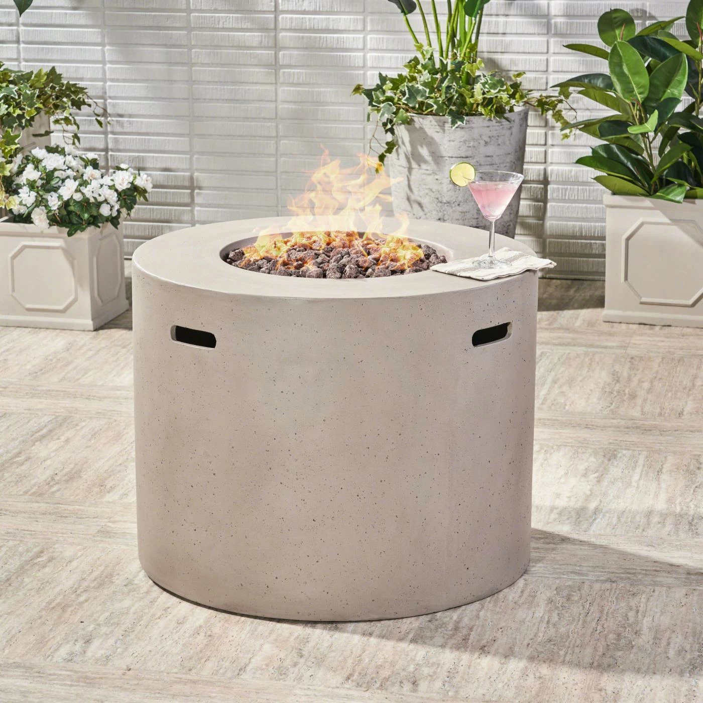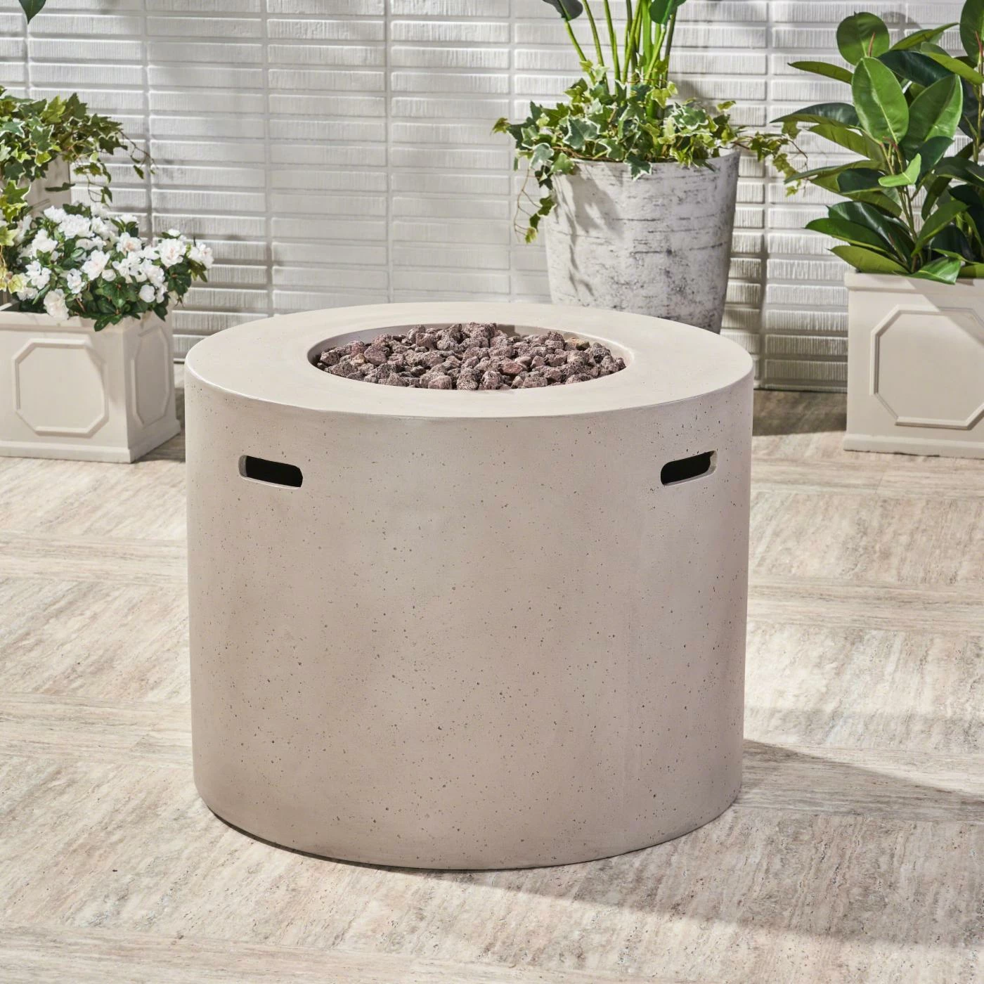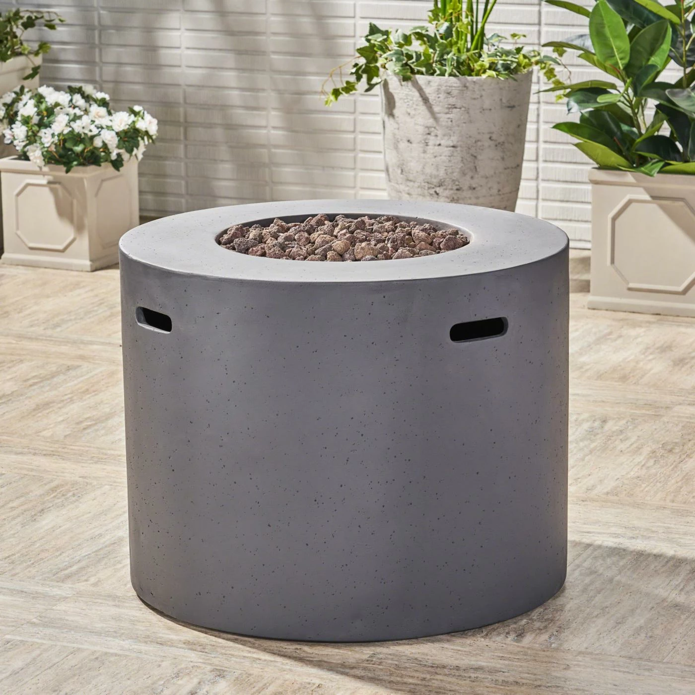 The Aidan Light Weight Concrete Gas Burning Fire Pit features a durable yet lightweight design for your outdoor space. This round fire pit is constructed of concrete and offered in your choice of available finishes. It emits 40,000 BTUs of warmth. Equipped with a cutout handle, a door lifts off to reveal a pedestal for your propane tank. Lava rocks are also included to accent the flame.