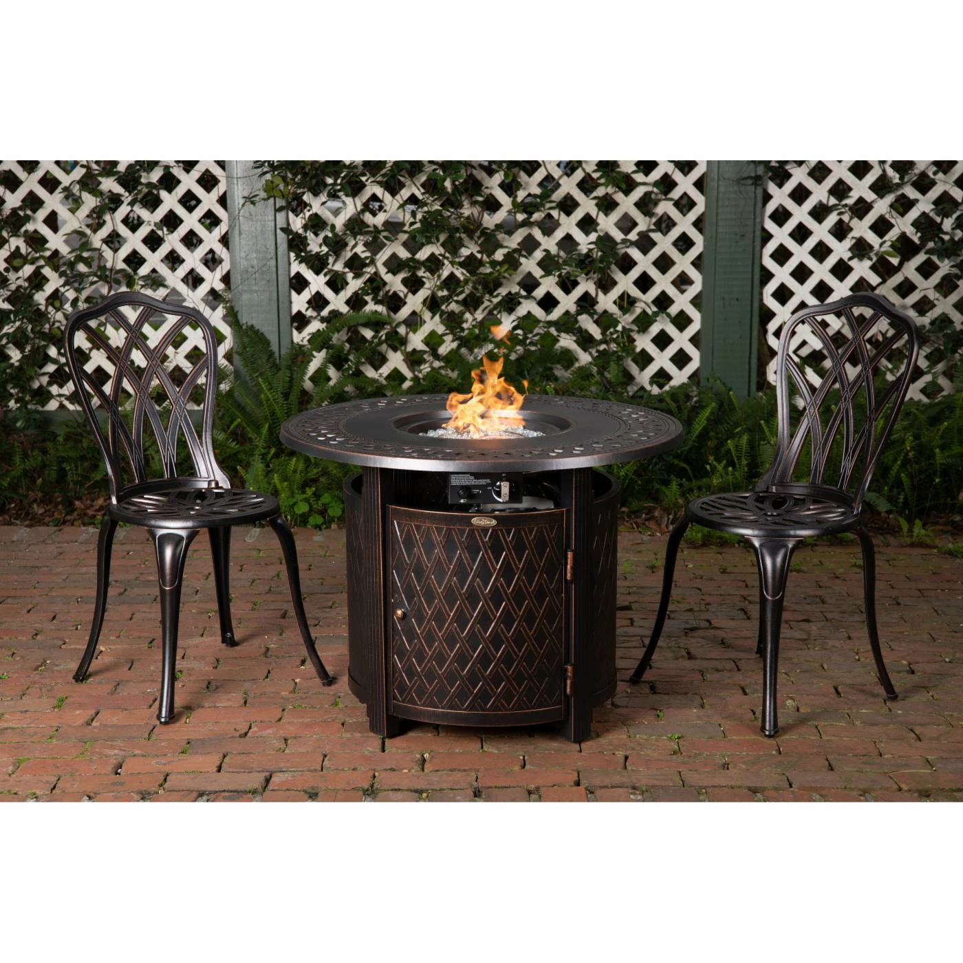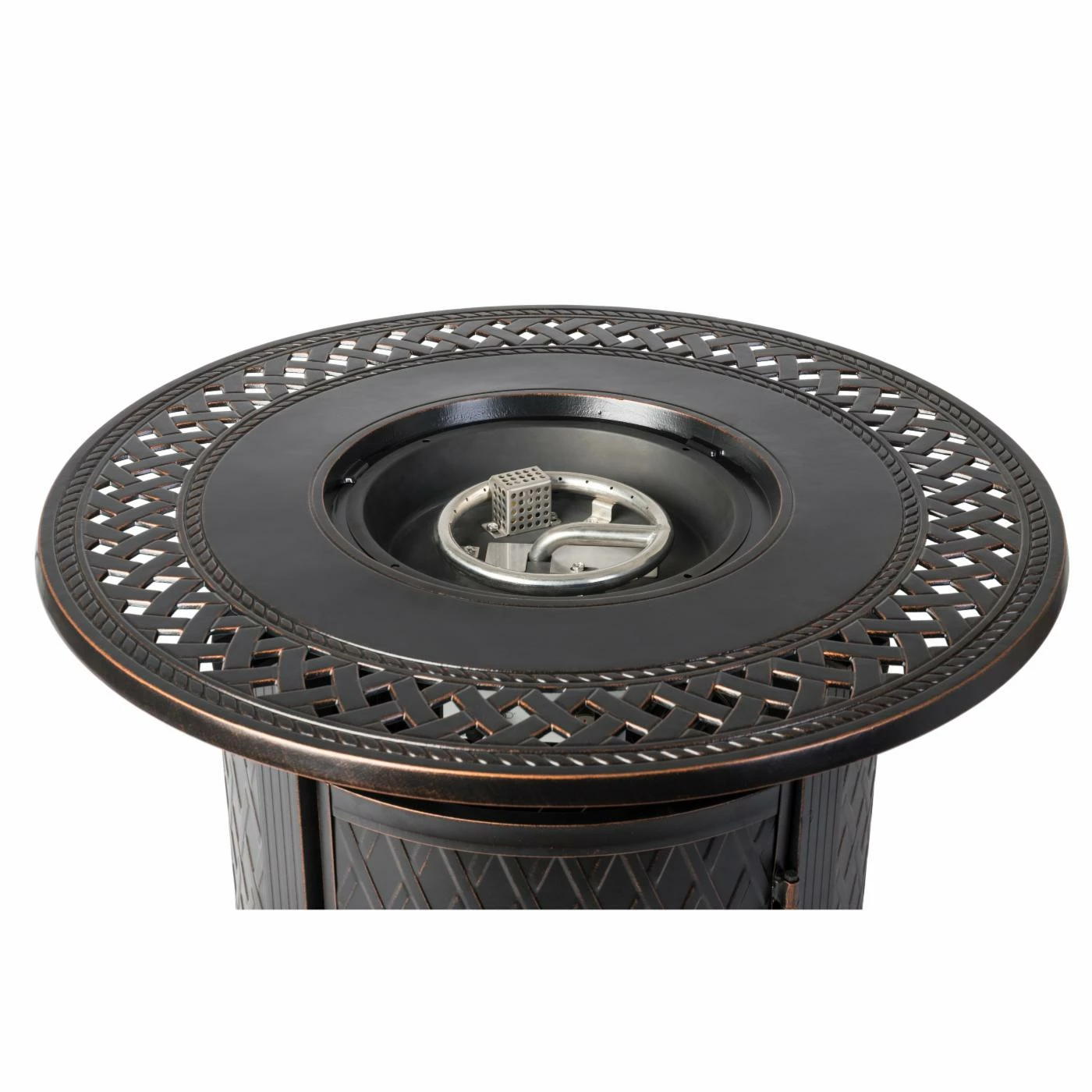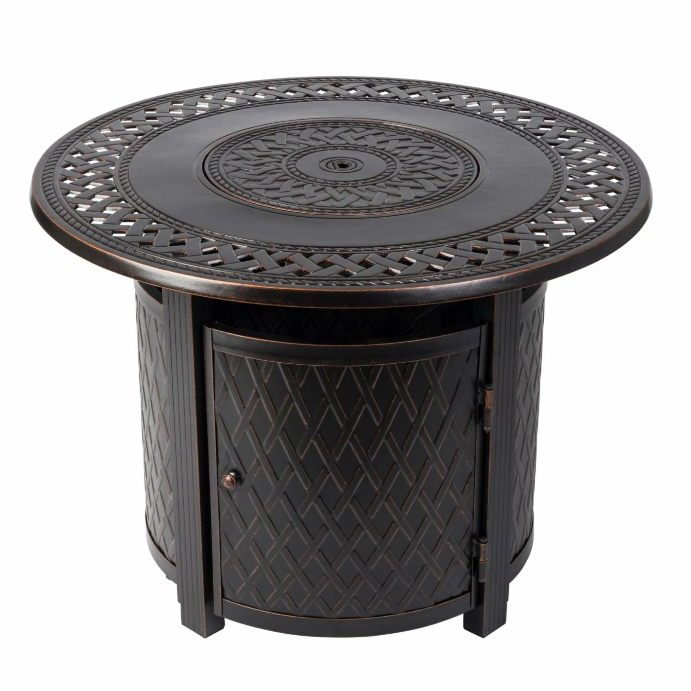 The Fire Sense Wagner 33 in. Round Aluminum Gas Fire Pit Table shows off a lattice-weave pattern and antique bronze finish compatible with classic and contemporary outdoor decor. With a practical aluminum build and an adjustable full-flame output of 37,000 BTU, this versatile and compact fire pit pulls double duty as a patio table when covered with the included fire bowl lid. Arriving with clear fire glass for a stylish touch, just add a standard 20lb propane tank behind the handy hinged door. A weather-resistant cover for the fire pit is included for your convenience.