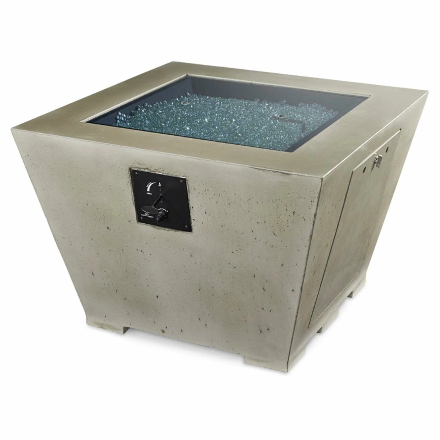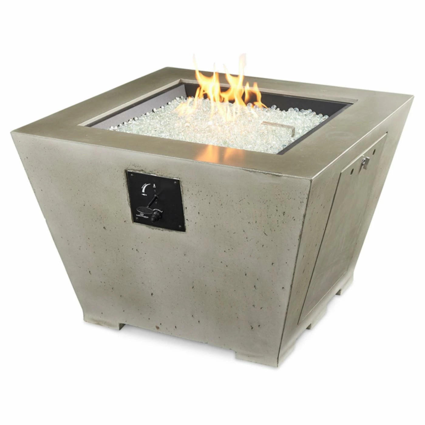 The night might be cool, but conversation is warm around the Outdoor GreatRoom Cove Square Gas Fire Pit Bowl. Chatter will no doubt center on this fire bowlβs unique design, too, which is crafted with fiberglass-reinforced Supercast concrete. Durable and non-combustible, the material has organic appeal with natural color variations, pitting, and wear thatβs at home in outdoor spaces. Surround the flat-black-coated stainless steel burner with the included glass beads to create crisp textural contrast. A piezo ignitor makes it easy to adjust the flame height; fuel the fire with either natural gas or liquid propane (tank not included). An access door in the base opens to tank storage. And when the fire dies down, protect the burner (and create a smooth tabletop) with the included grey glass cover. Several manufacturerβs warranties are included: one-year limited coverage on parts, three-year limited coverage on the base and top, and limited lifetime coverage on the burner.