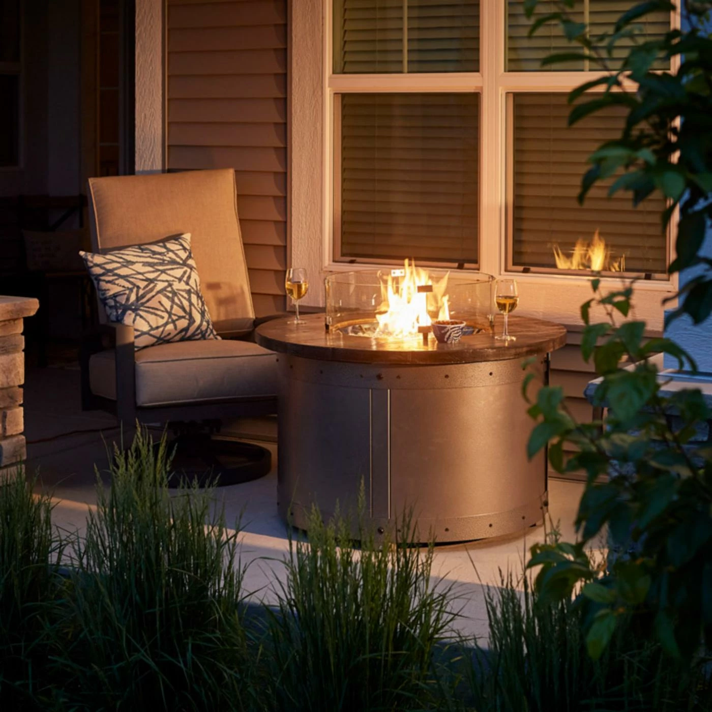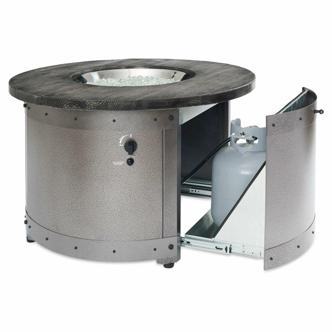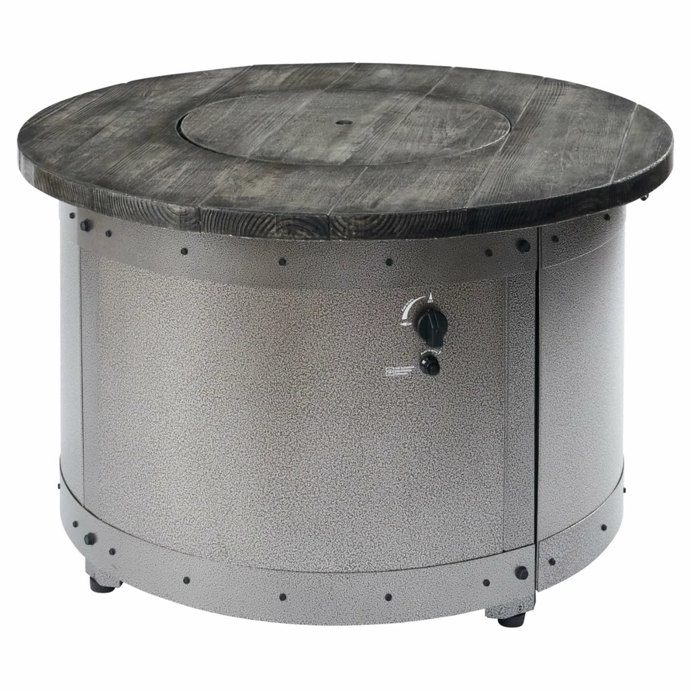 Warm and rustic, the Outdoor GreatRoom Edison Round Gas Fire Pit Table is a natural centerpiece for cozy conversation on the porch or patio. The pewter powder-coated stainless steel drum base is topped with innovative, fiberglass-reinforced Supercast concrete that mimics the look of wood without presenting a fire or durability risk. Instead, the non-combustible material has a weathered gray barnwood look perfect as an outdoor accent to modern farmhouse homes. The UL-listed crystal fire burner puts out up to 55,000 BTUs; fuel the fire with a 20-pound propane tank tucked behind the access door in the base (tank not included). When the fire dies down, protect the burner (and create a smooth tabletop) with the included Supercast cover. Several manufacturerβs warranties are included: one-year limited coverage on parts, three-year limited coverage on the base and top, and limited lifetime coverage on the burner.