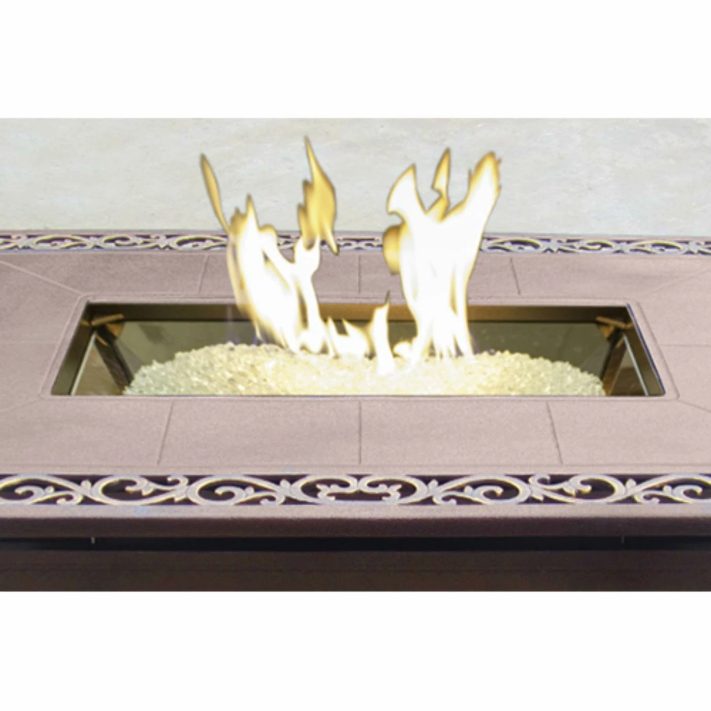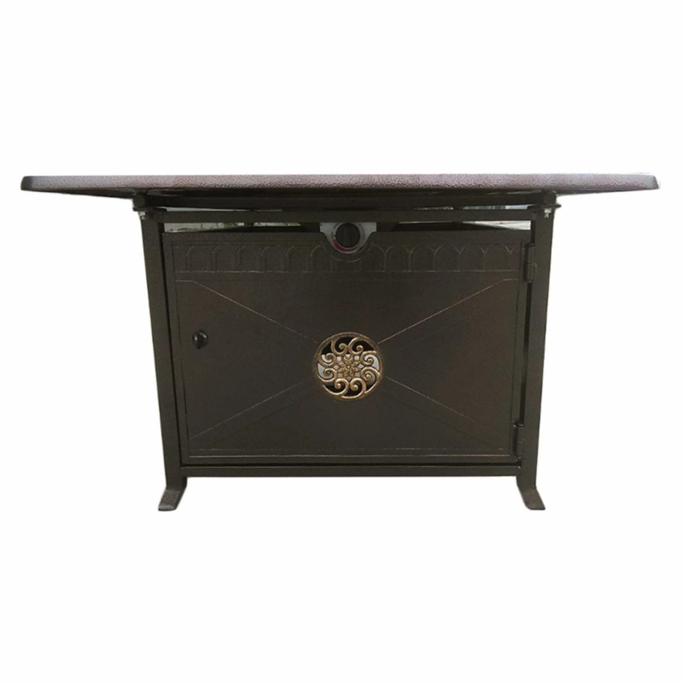 With its gold scrollwork and handsome bronze finish, the AZ Patio Heaters Hiland Scroll Design 49.5 in. Fire Table is a distinguished way to elevate your patio to outdoor living space. The large tabletop offers ample space for your morning coffee, after work cocktail, and plates, too. This rectangle gas fire pit table is made of cast aluminum and includes a removable lid for easy access to the fire pit within. The propane tank tucks out of sight in the base of this fire pit table.