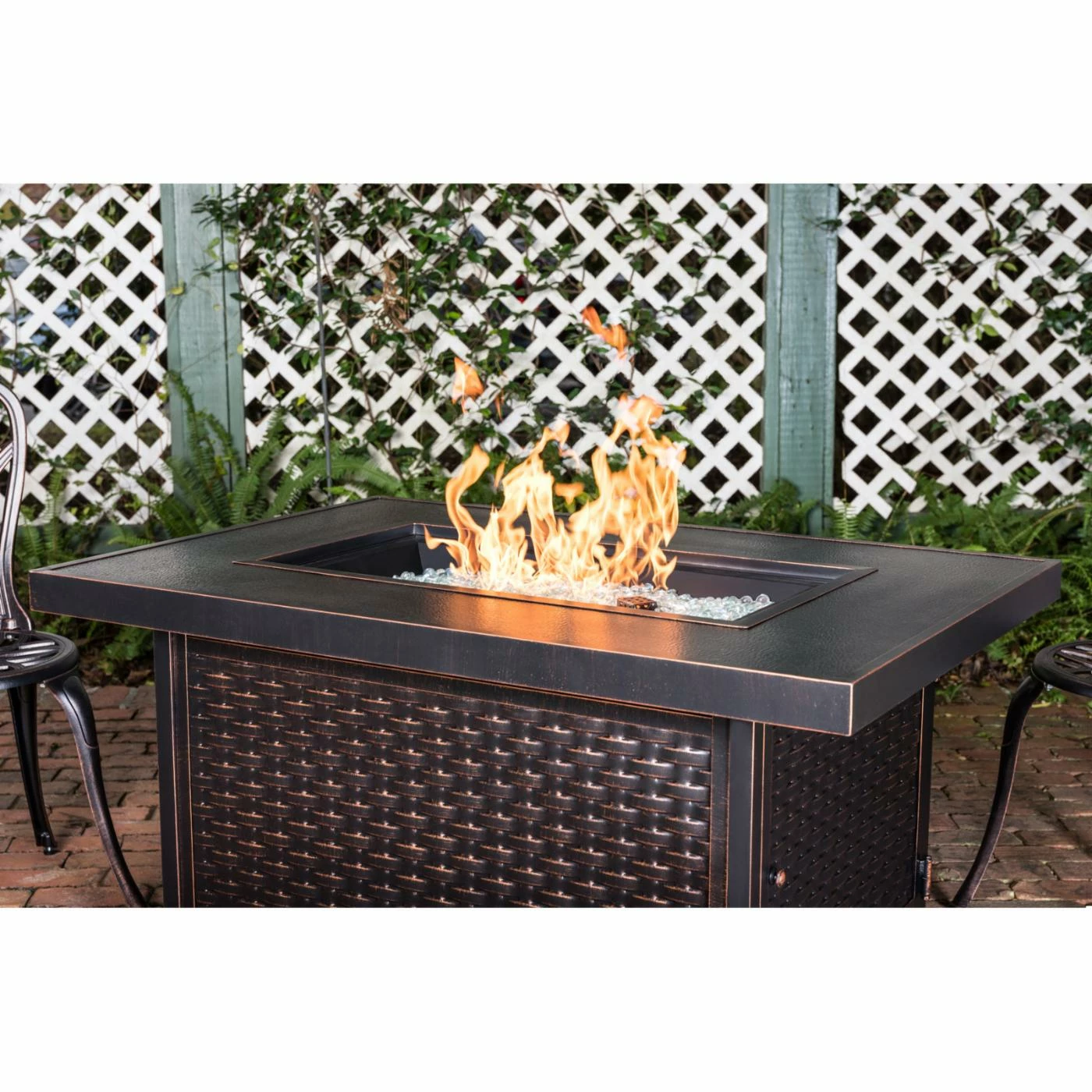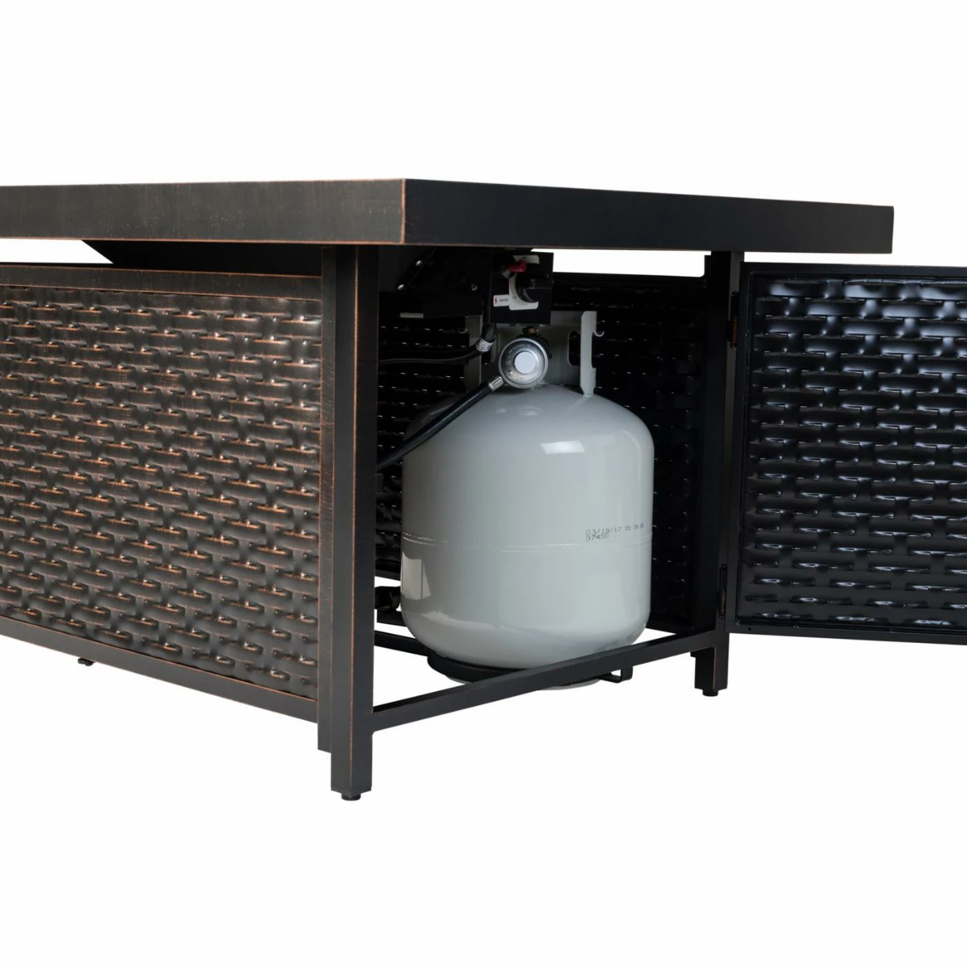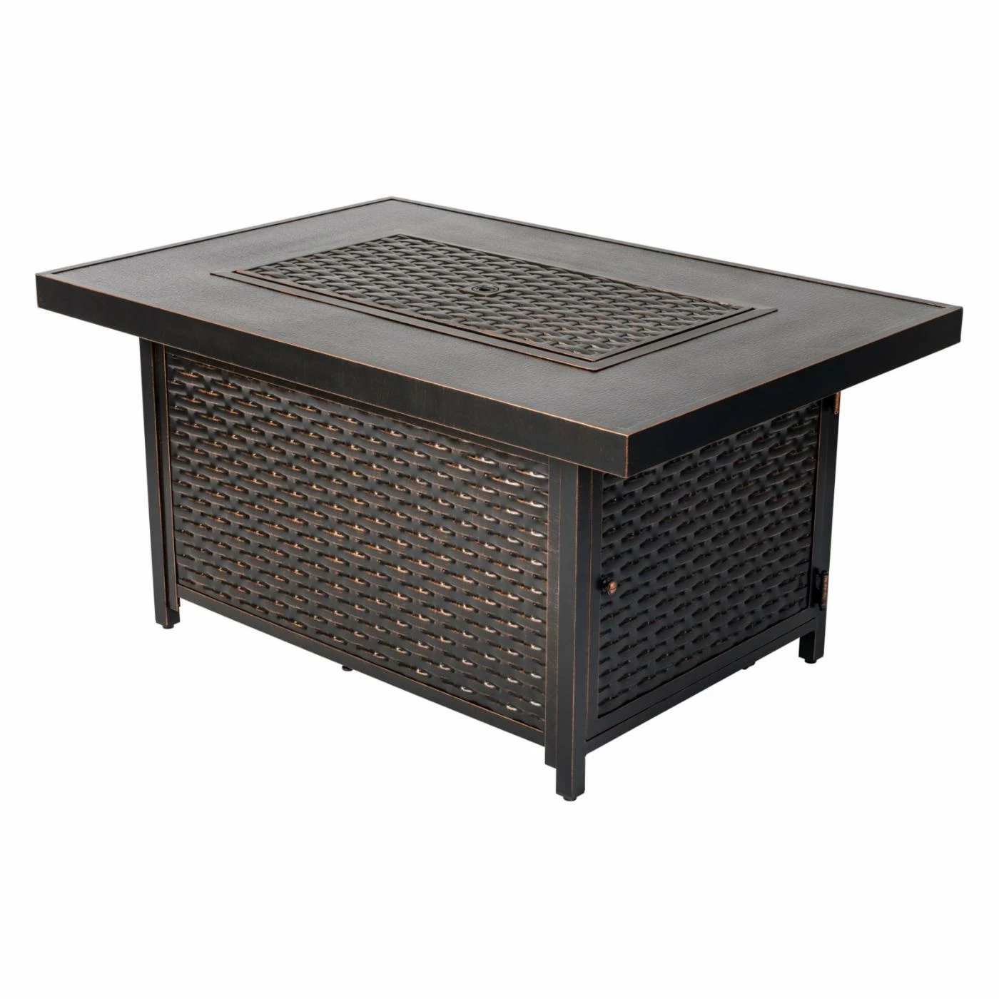 Toast s’mores over the Fire Sense Baker 48 in. Fire Pit. This fire pit emits a wide flame with 50,000 BTUs from a high-temp painted steel burner. It’s durably constructed of aluminum and features an antique bronze finish. A basketweave texture gives it a traditional look. For easy access to the interior fuel tank, it’s equipped with a hinged door.