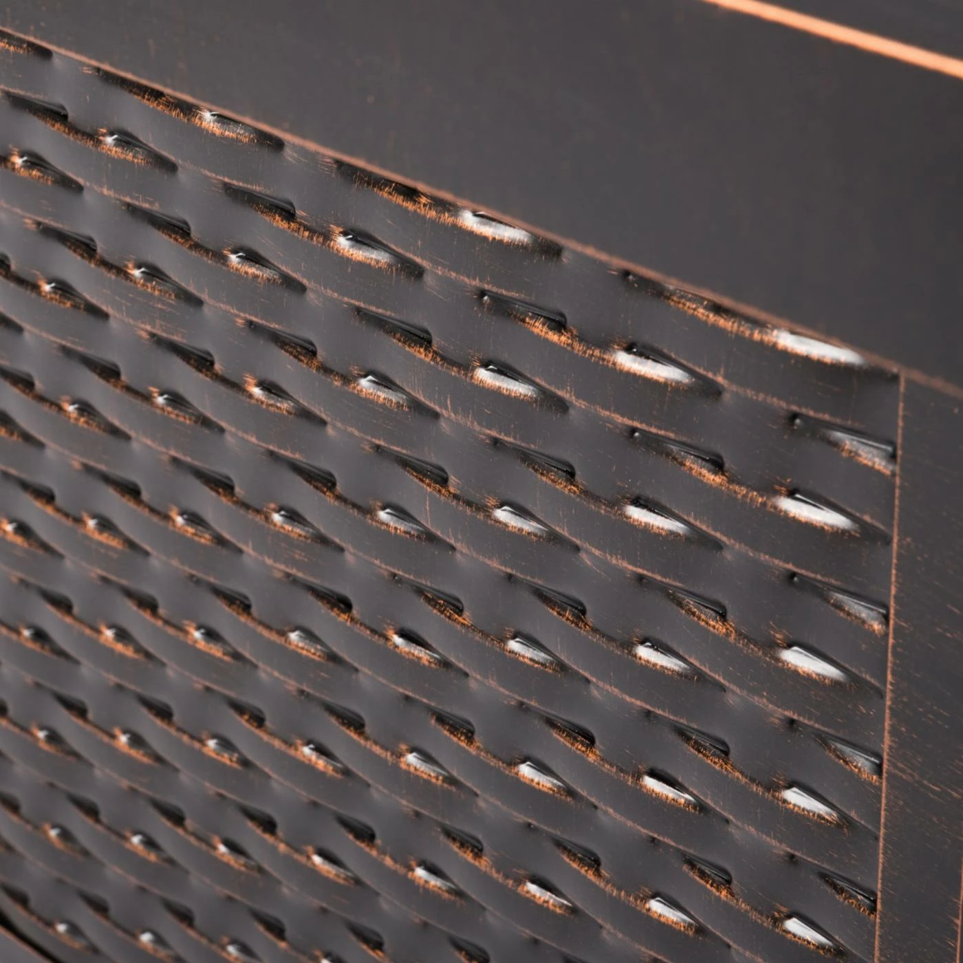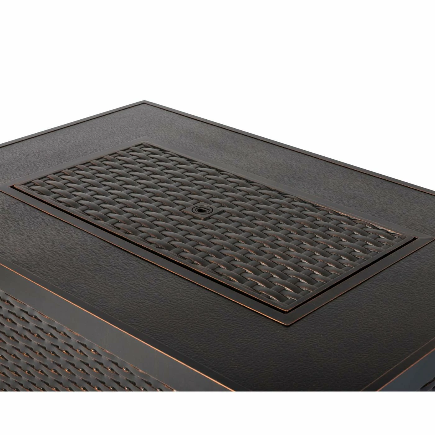 - Rectangular table features basketweave texture