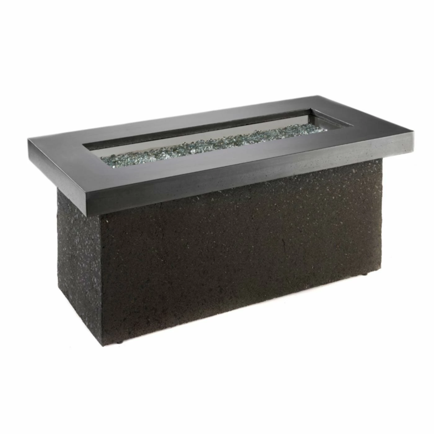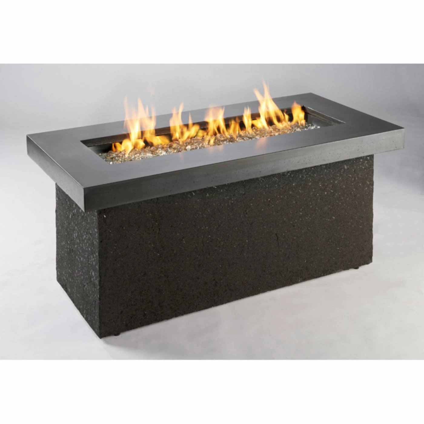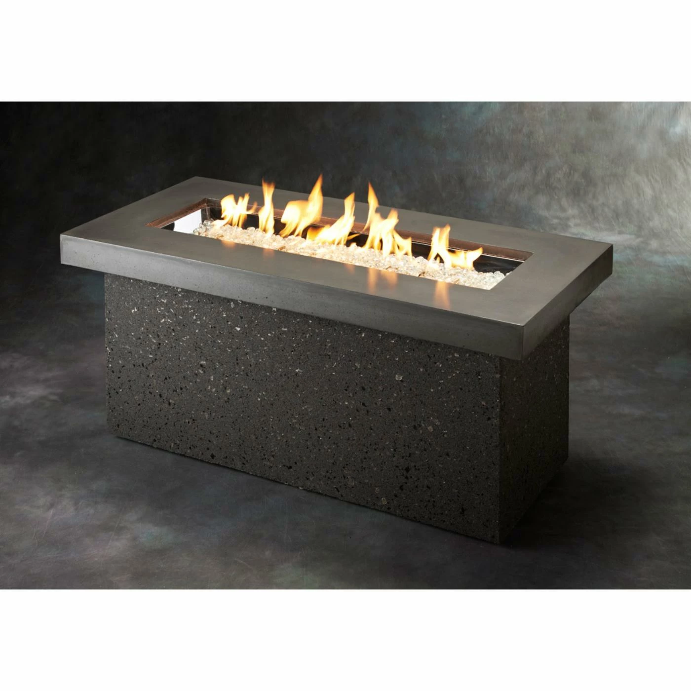 Fire may have been the invention of the cave man, but the Outdoor GreatRoom Key Largo 54 in. Fire Table uses all-modern technology for your own outdoor man (or woman) cave. The rectangular Supercast top has a 42-inch linear crystal fire burner that holds the included diamond glass fire gems. The no-fuss electronic piezo controls allow for an adjustable flame height, and the outdoor-grade, gray base stores one 20-pound liquid propane tank (not included) inside. A supercast tabletop with a Midnight Mist finish completes the design, and a natural gas conversion kit also comes included.