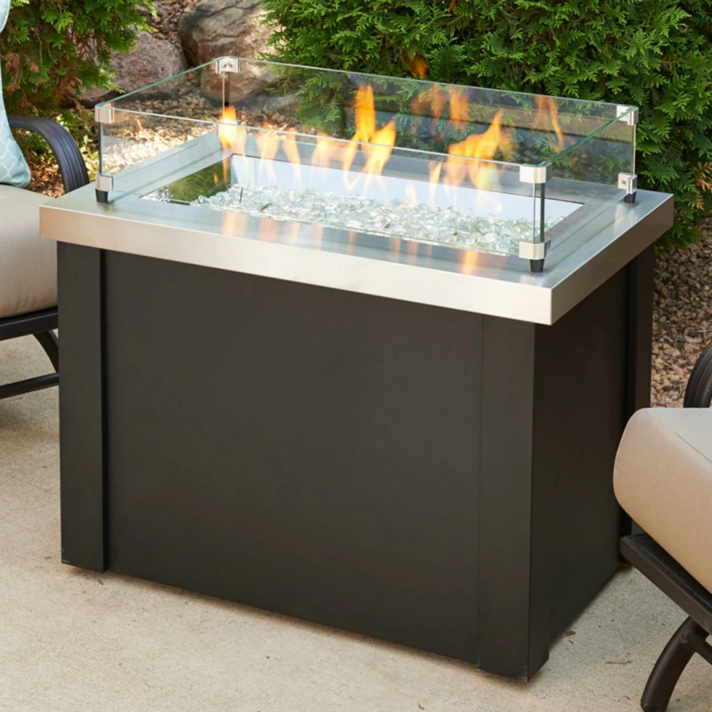 Comforting warmth and contemporary style come to the back porch or patio with the Outdoor GreatRoom Providence Stainless Steel Fire Pit Table with Optional Glass Guard nd Burner Cover. Its sleek, modern design features a black metal base that can hold a 20-lb. propane tank (not included). The sturdy base supports a shimmering stainless steel top fitted with a generously sized 1224 Crystal fire burner filled with clear glass for the illusion of melting gemstone when the fire comes to life. An optional burner cover and tempered glass guard are also available at an affordable price. The guard is an especially welcome addition since it protects the flame from the wind while also adding a safety barrier for your party.