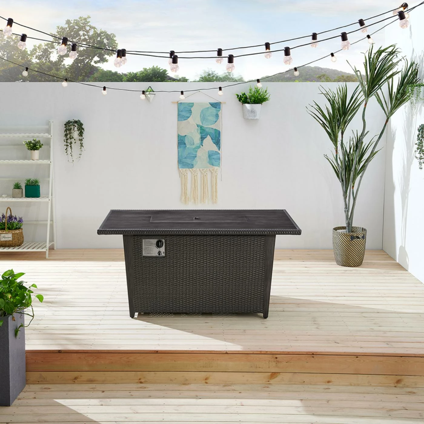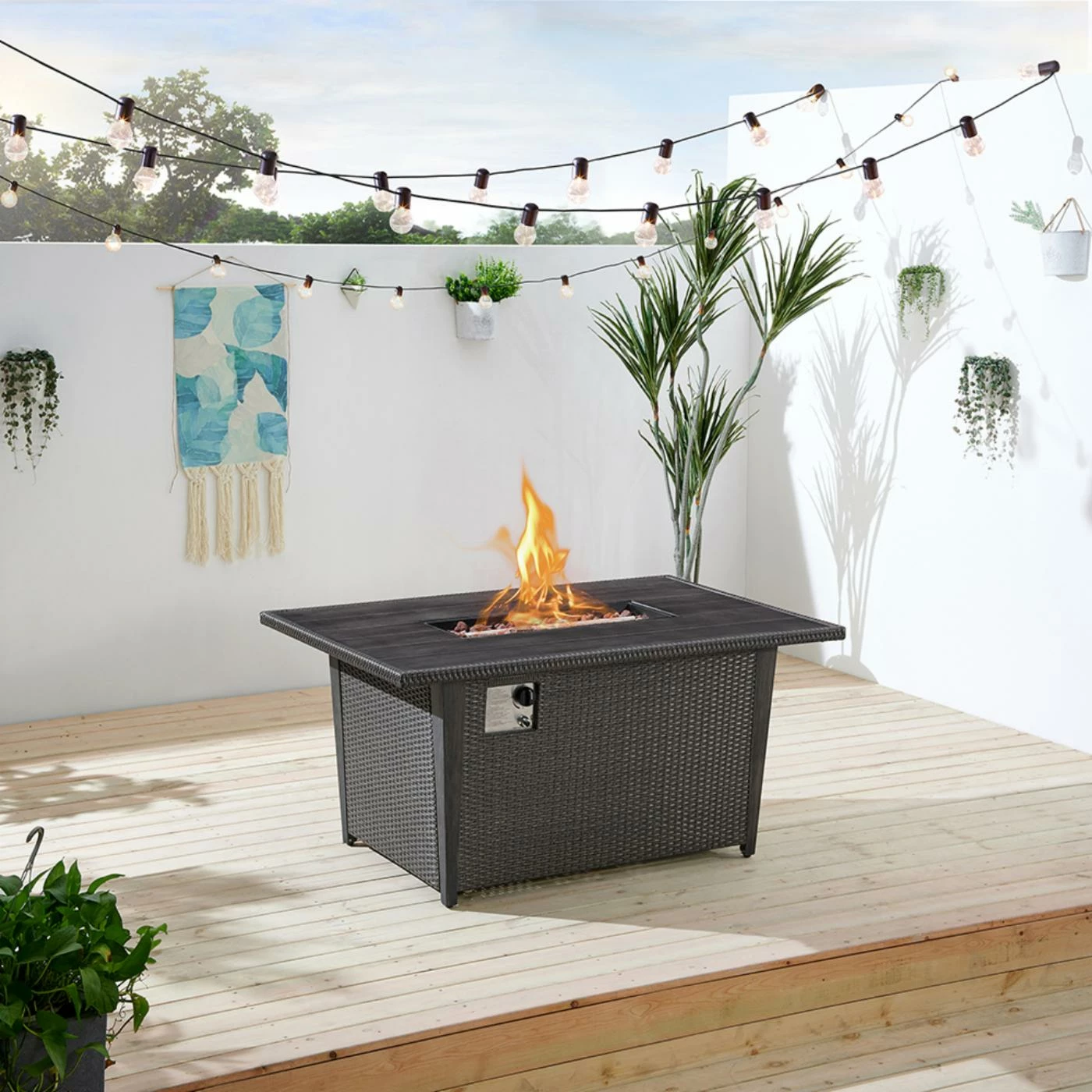 Beautiful resin wicker and a faux wood planked top make the OVE Decors Bentley II Fire Table nearly as enticing as the golden orange flames it produces. The frame is outdoor safe and the wicker resists UV damage that causes fading and cracking. This fire pit also includes decorative lava rocks and a burner cover.
