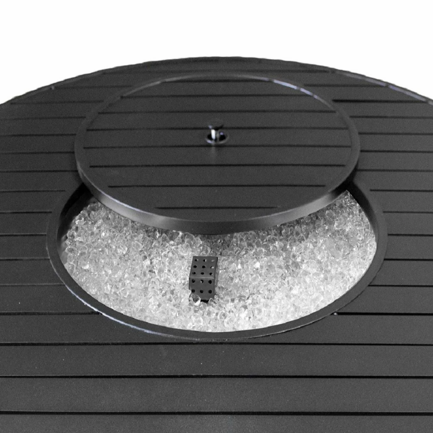 The perfectly stylish AZ Patio Heaters Hiland Slatted 46 diam. Fire Table doubles as a table. Its round shape and generous 46-inch diameter tabletop offer plenty of room for plates, cocktails, or your morning coffee ritual. This round gas fire pit table is made of cast aluminum, features a casual slatted look, and comes in classic black. A removable lid offers easy access to the fire pit within. Tuck your propane tank out of sight in the round base of this fire pit table.