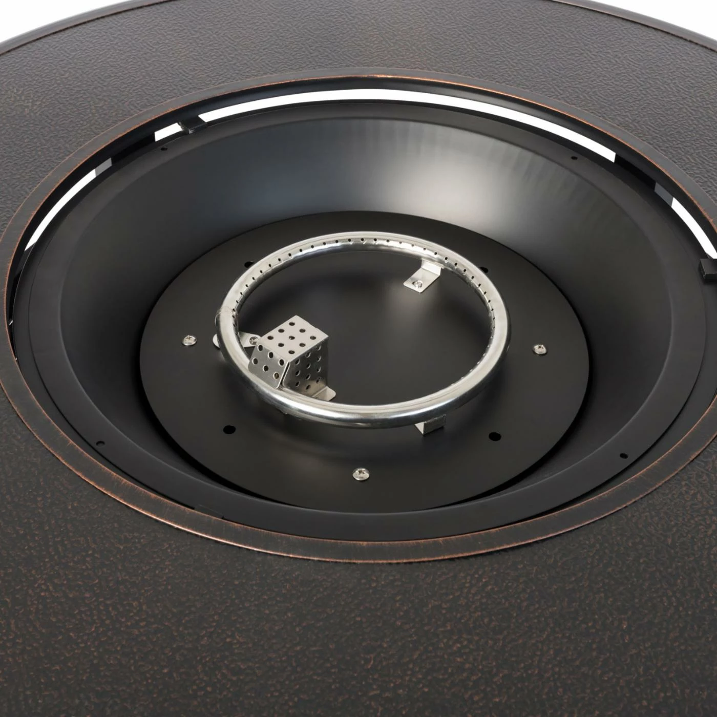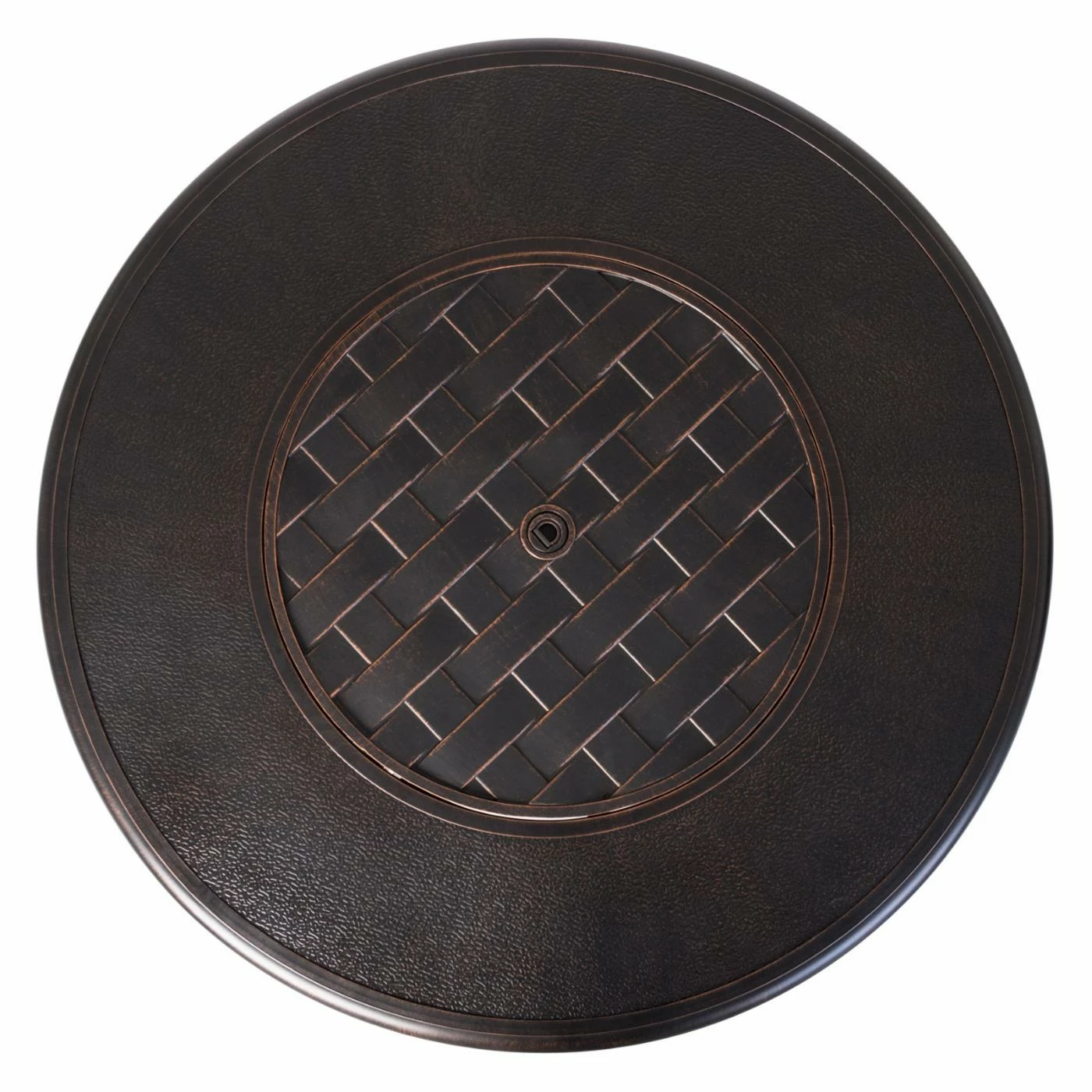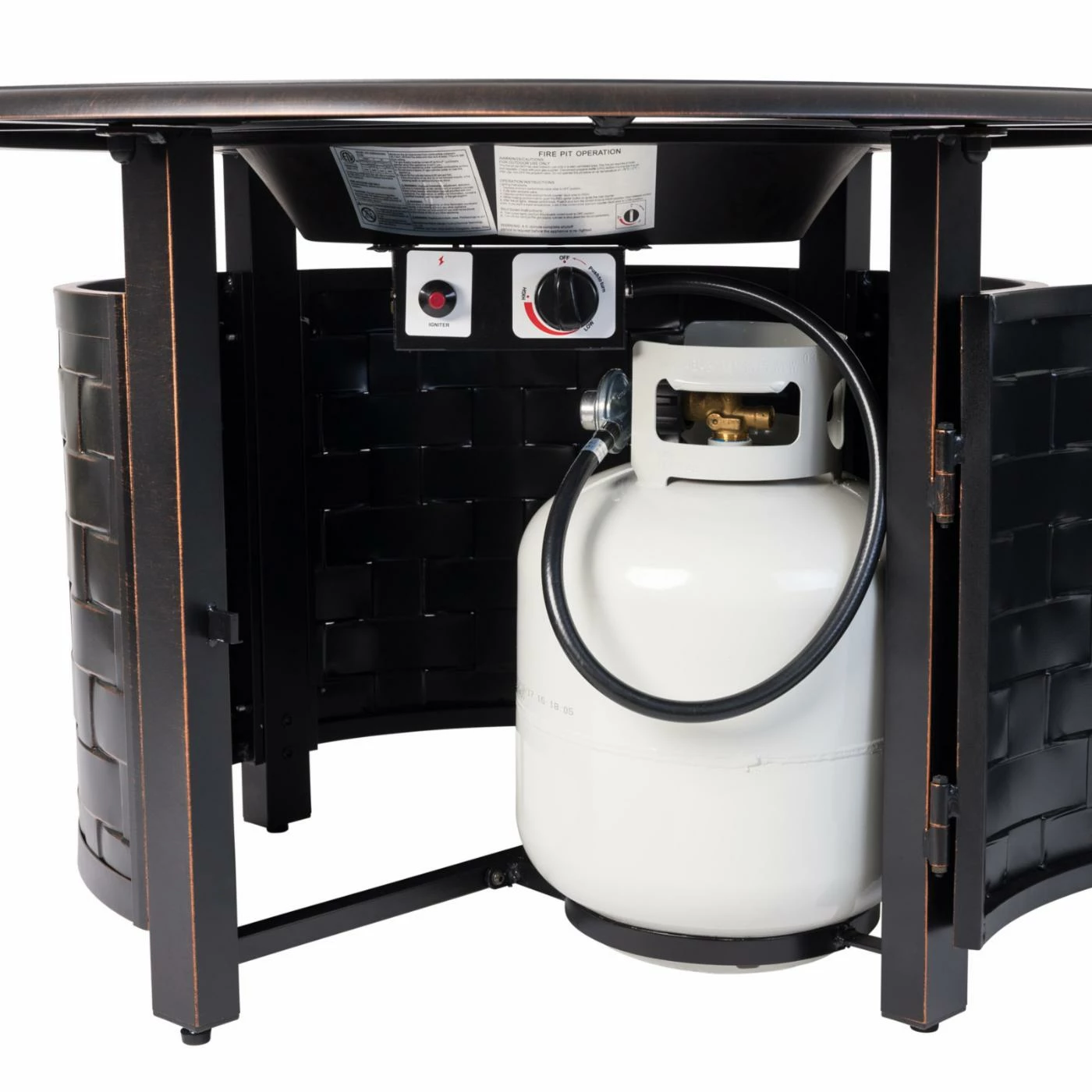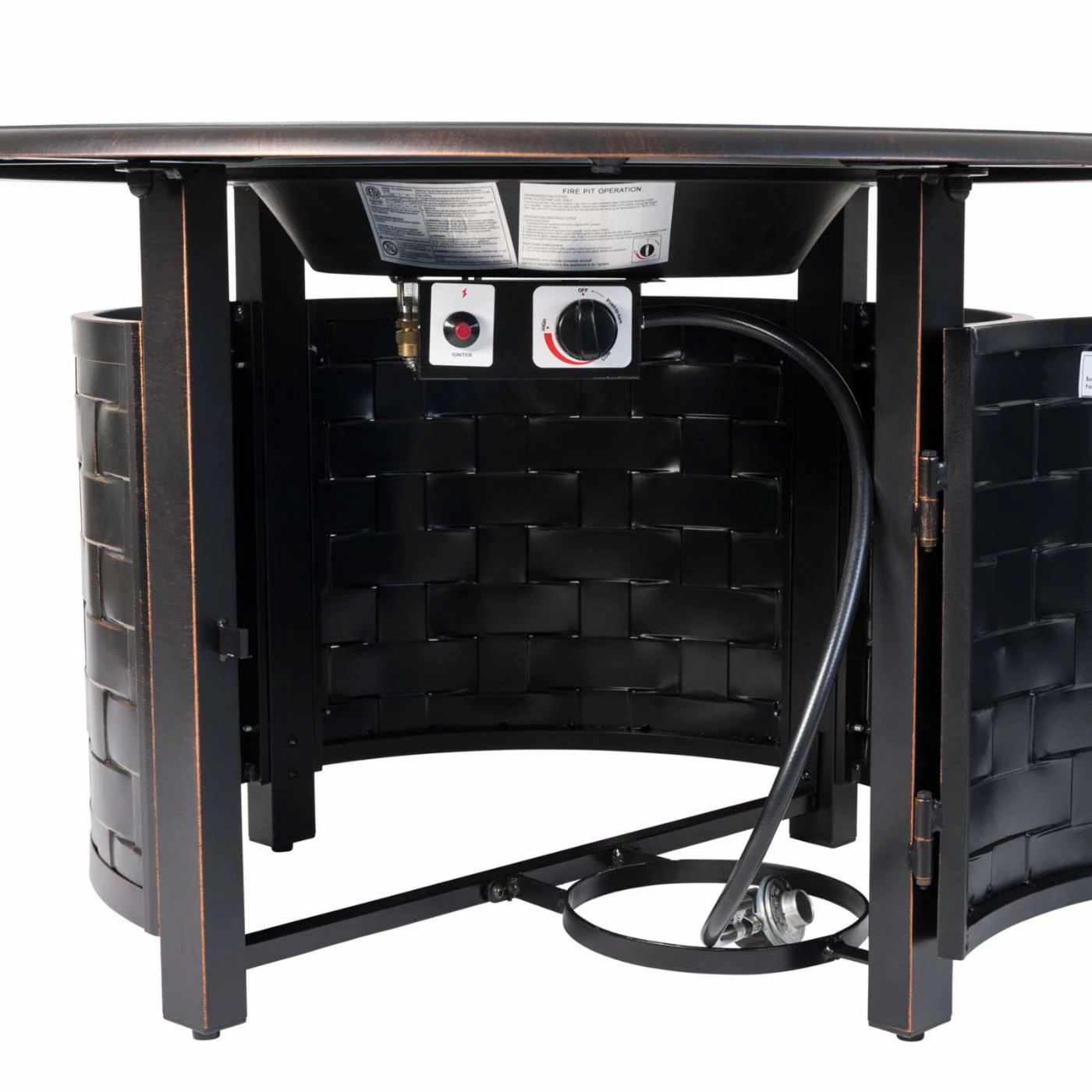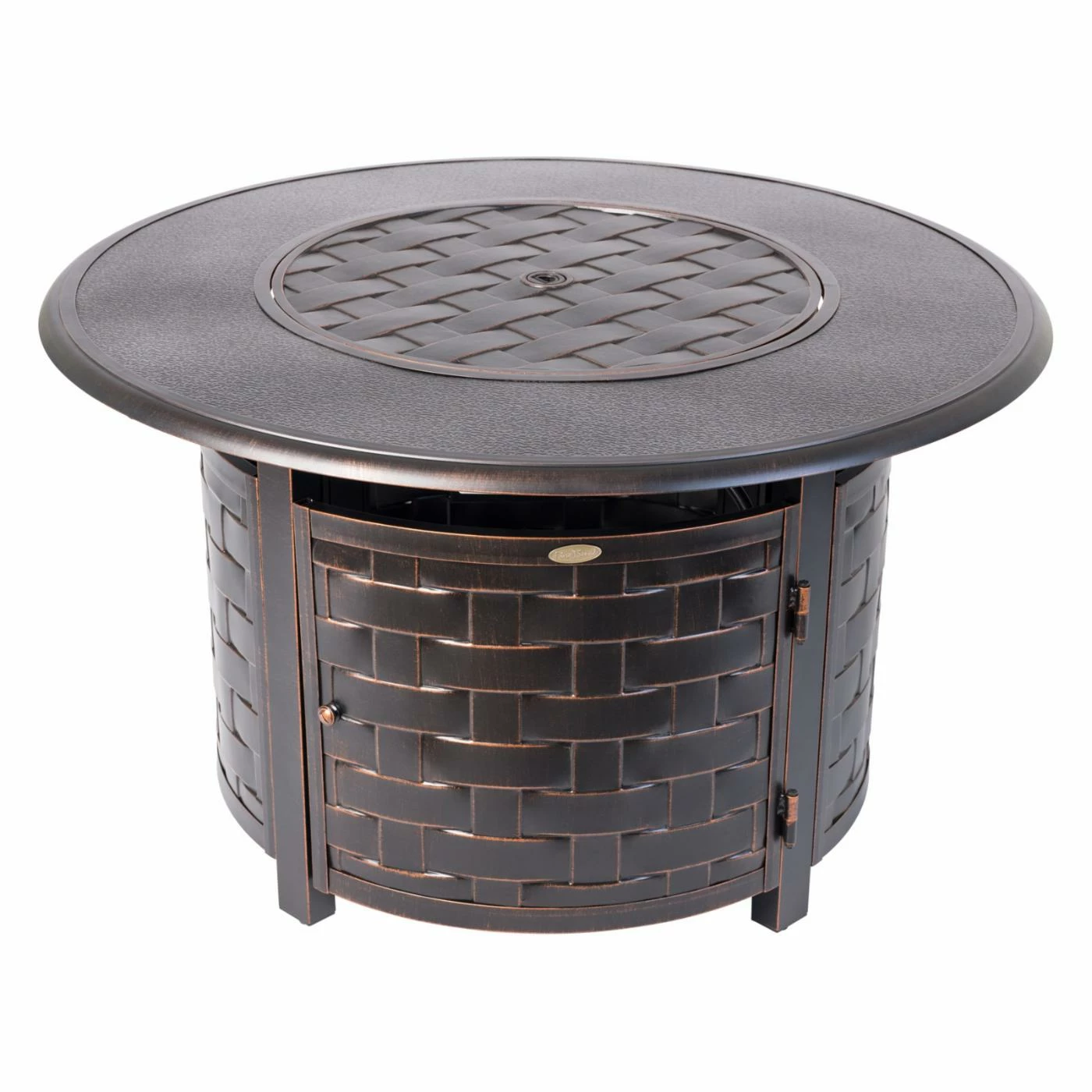 A wide basketweave design gives the Fire Sense Armstrong 42 in. Fire Pit traditional style. This fire pit table is durably constructed of aluminum and features an antique bronze finish. A hinged door provides easy access to the interior fuel tank. When it’s time to call it a night, top the high-temp painted steel burner with the included cover.