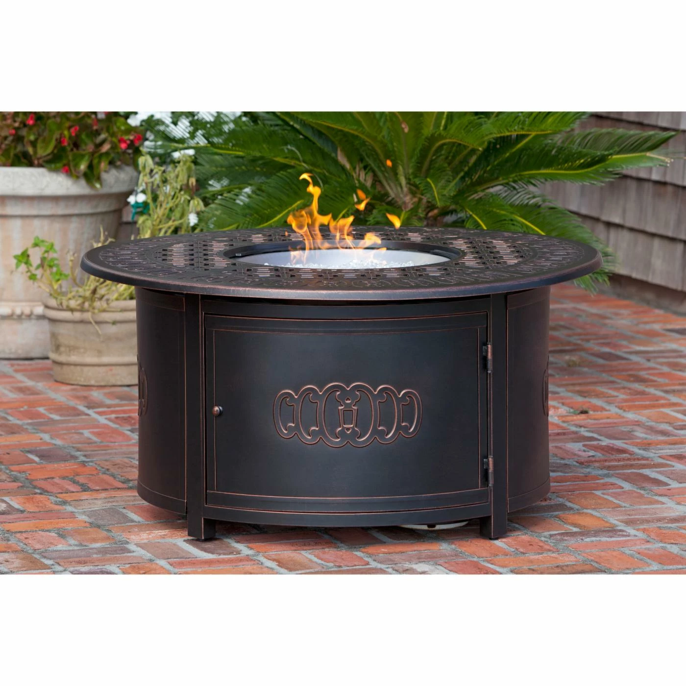 Our rustic Fire Sense Dynasty 48 diam. Fire Table keeps your outdoor space welcoming well into the cooler seasons. This 50,000 BTU fire pit with a stainless steel burner operates on a standard 20 lbs. propane tank that sits safely inside and is accessed through the hinged door. When it’s not in use, the cast aluminum cover easily converts the fire pit into a convenient patio table. This aluminum fire pit features an antique bronze finish, geometric textured top, and a beautiful full flame surrounded by clear fire glass for a warm and inviting look perfect for any patio.