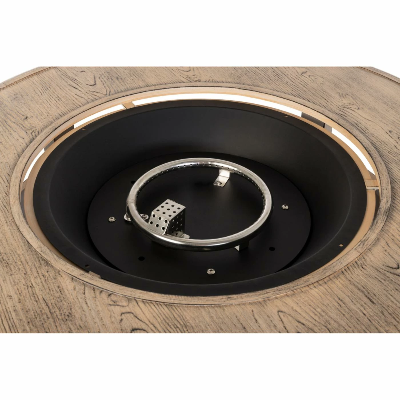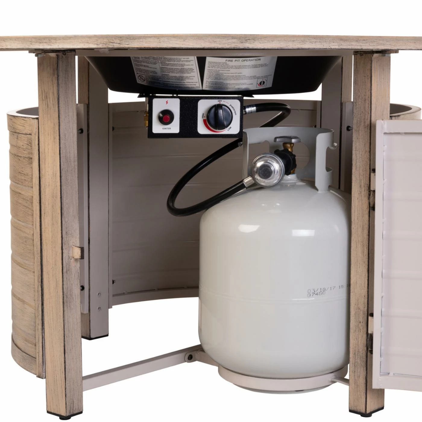 A brushed finish and faux wood texture give the Fire Sense Thatcher 42 in. Fire Pit a rustic look. This round fire pit table is durably constructed of aluminum. The driftwood finish is easy to pair with your favorite patio chairs. The high-temp painted steel burner boasts an output of 50,000 BTUs. For easy access to the fuel tank, this fire pit is equipped with a hinged door.