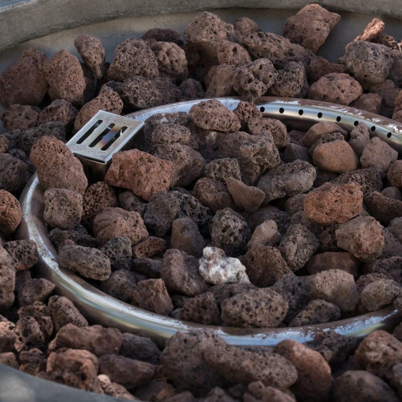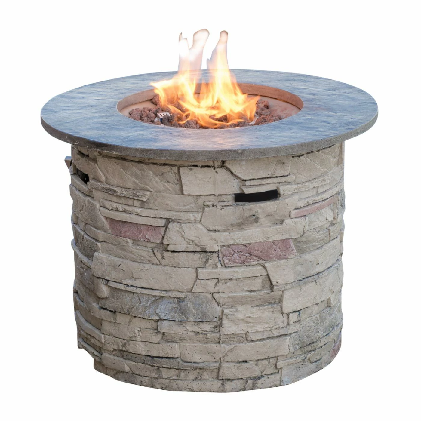 Cozy and intriguing, this HN Outdoor Brecksville Propane Gas Fire Pit has a circular design of natural fitted stones with a gray slate top. Itβs just the right size for intimate patio groupings. This fire pit features 40,000 BTUs of propane heat that rises up through magnesium oxide stones. An interior tank makes this fire pit portable and versatile.