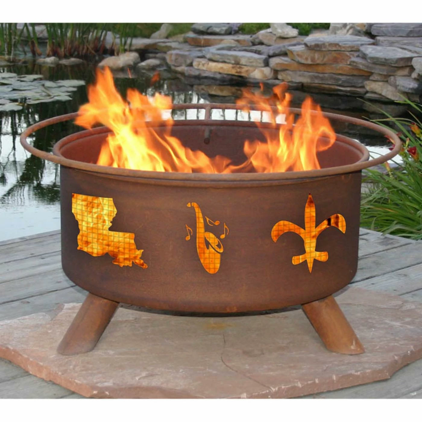 Find the perfect pit for your parish – the Patina Mardi Gras 31 diam. Fire Pit Set with Grill and Free Cover. With large screen-backed cutouts of Louisiana, New Orleans, and a Fleur de Lis, this is a hot way to represent. Made of durable cold-rolled steel, this metal bottom fire pit with legs is perfect for camping and backyard entertaining. Includes a BBQ grill insert, a poker and a spark arresting safety screen. Natural rust patina finish. No assembly required. FREE fire pit cover is included!