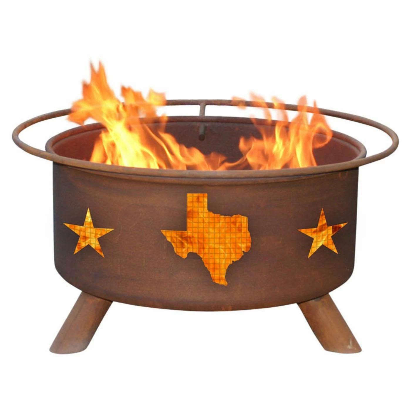 Enjoy a classic backyard barbecue with the Patina Texas State and Stars 30 diam. Fire Pit with Grill and Cover. This hand-crafted firepit is constructed from cold-rolled steel and features a natural rust patina finish that ages spectacularly over time. The body of the pit features die-cut shapes of the Texas state silhouette and stars while the interior of the bowl comes with a mesh screen to keep stray sparks from escaping. The legs are welded to the base for stability and means that no assembly is required. The safety ring makes a convenient carrying handle or footrest. The firepit is intended for use with wood or charcoal fuel.