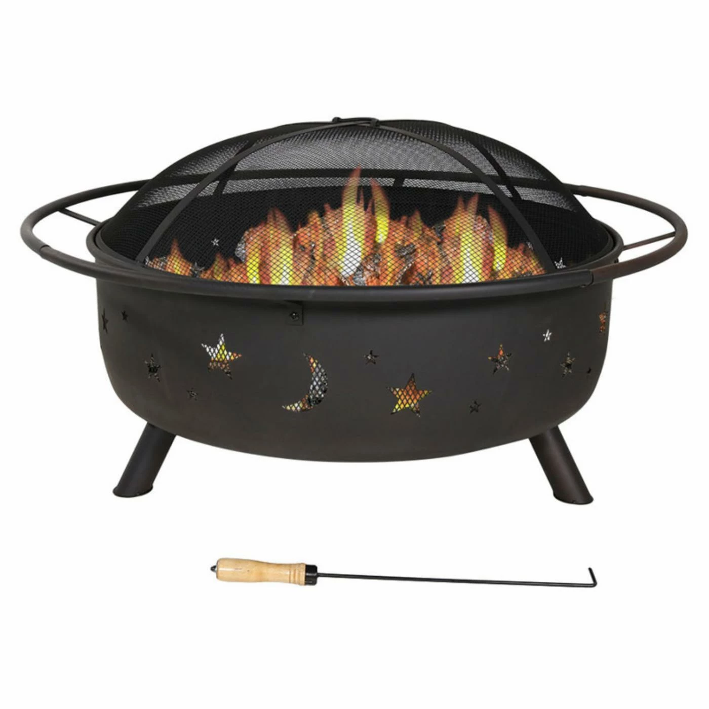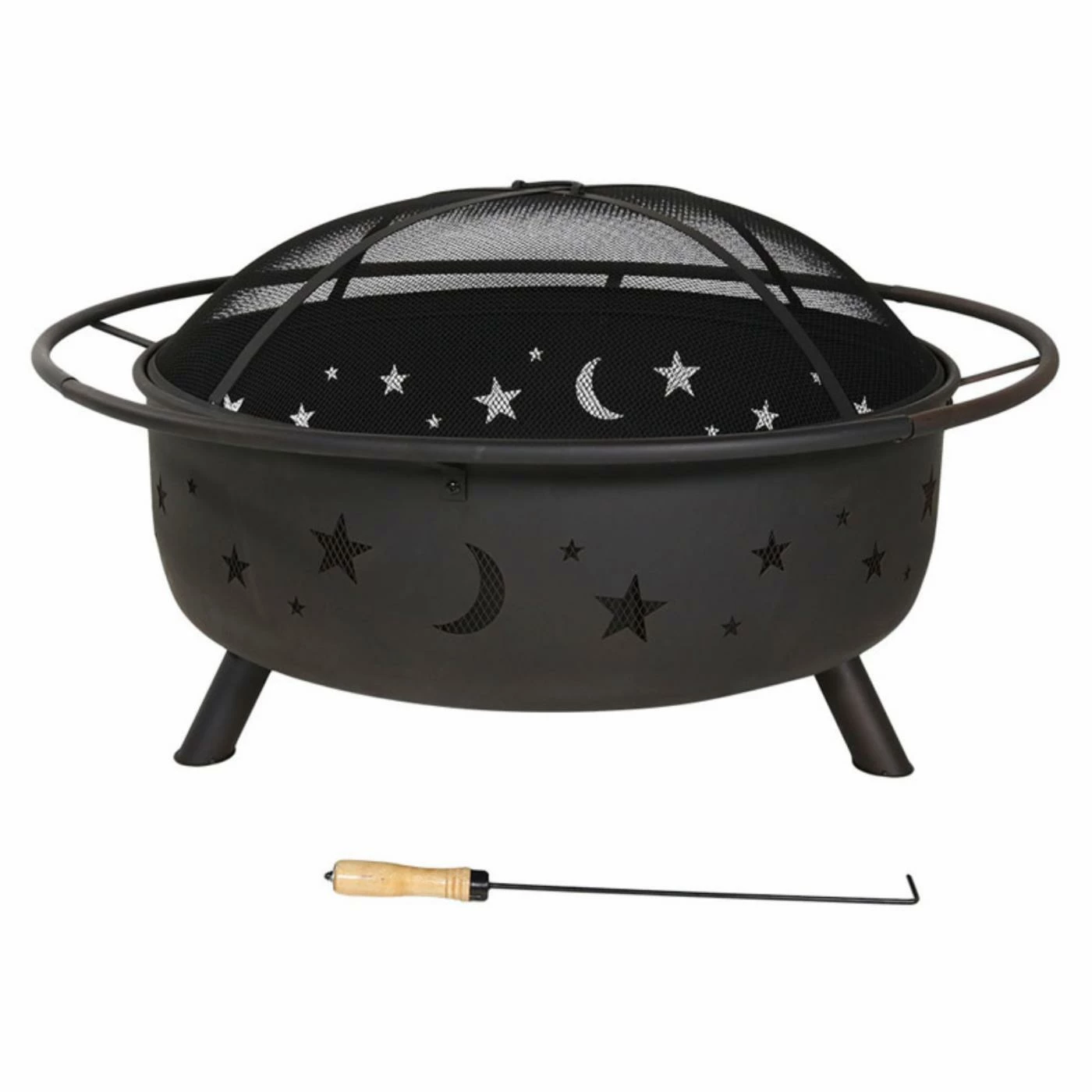 You’ll be ready for kabobs and burgers on the grill with the Sunnydaze Decor Cosmic 42 in. Fire Pit with Spark Screen. A removable cooking grate gives you the ability to cook over the flames or simply enjoy the light and warmth of the fire. The star and moon side cutouts help keep air circulating and oxygenating the fire. For protection from sparks, the fire pit comes with a simple-to-lift screen crafted out of steel mesh. The included poker can be used for moving the screen and for tending to your wood.