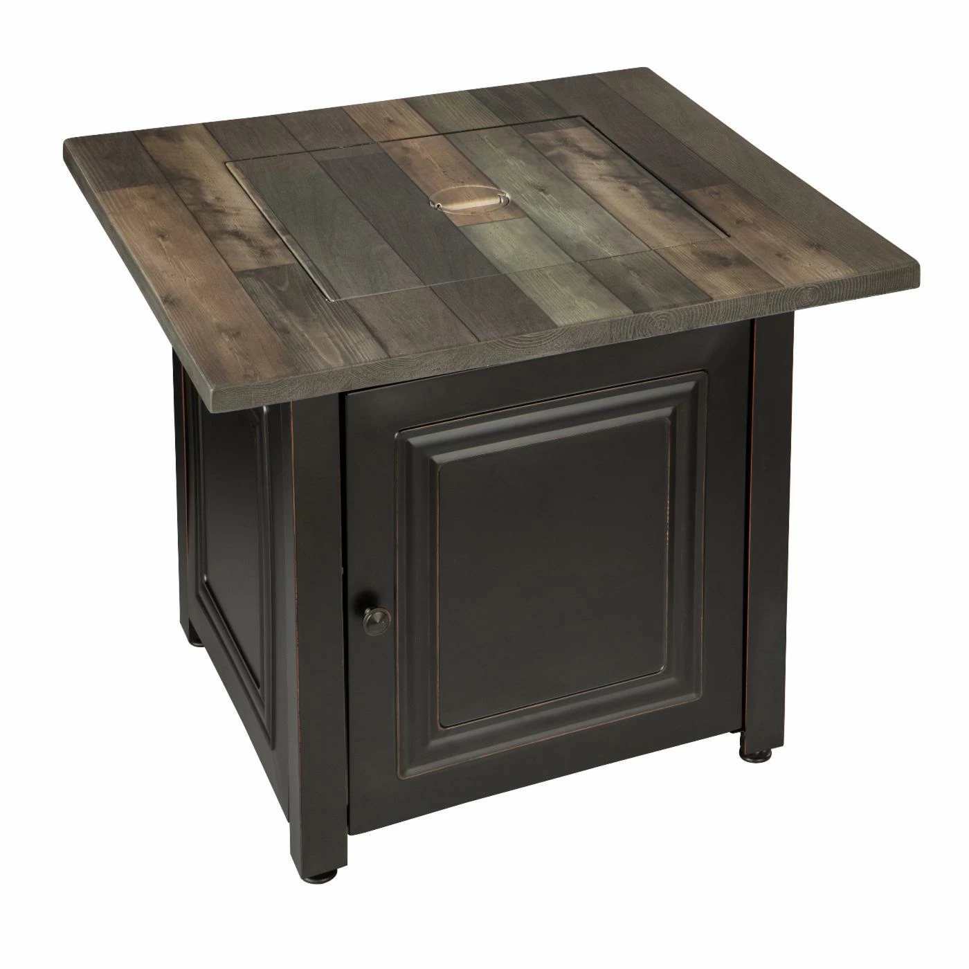 Create a rustic centerpiece for your outdoor living space with the Endless Summer Burlington 30 in. LP Gas Fire Pit. This base has an oil rubbed bronze steel base and a stylish wood grain printed resin hearth, bringing the warmth of a fireplace to your deck, backyard, or patio. Enjoy an evening fire without the mess of wood burning with this firepits 50,000 BTU stainless steel burner and integrated ignition. This unit also comes with bronze fire glass, a table insert to match the mantel which is conveniently stored inside the unit in Hide-A-Way feature when not in use, and a protective cover.