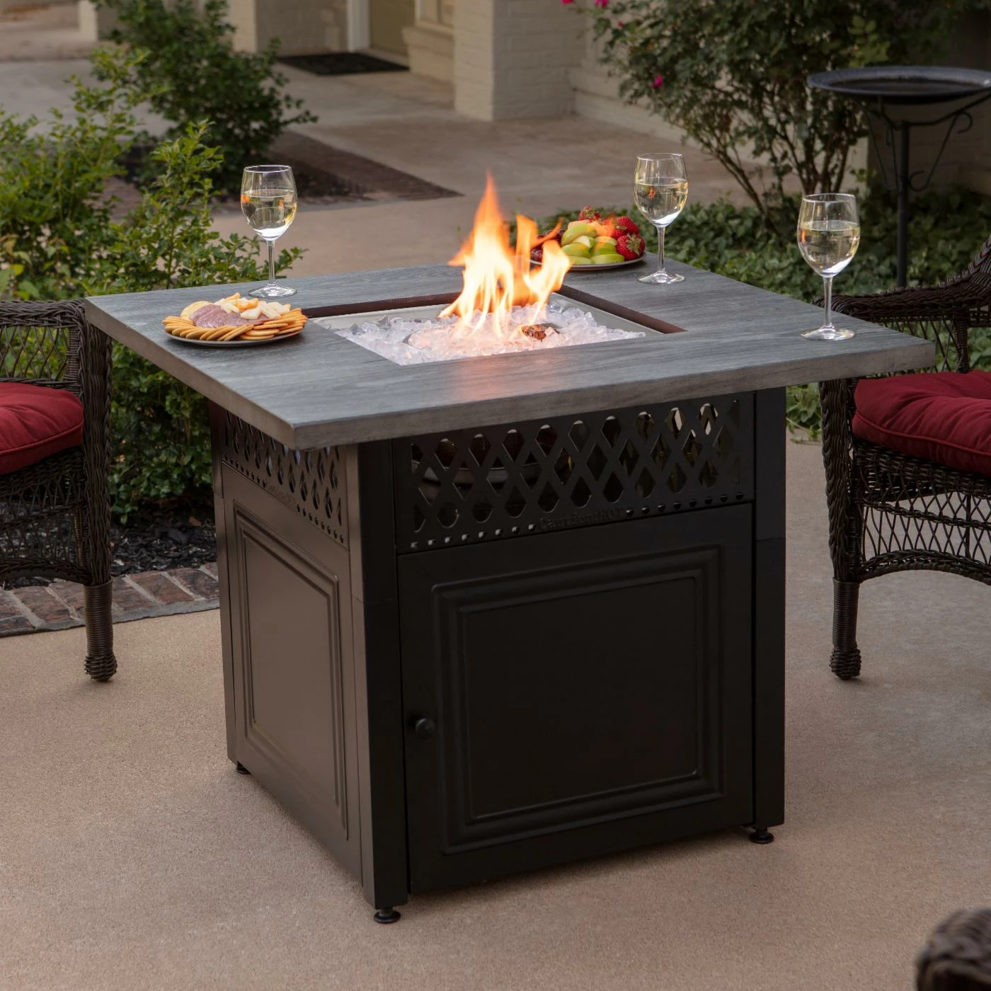 With its durable steel base and protective cover, “The Dakota” DualHeat fire pit can withstand every element while maintaining the rustic charm of its faux woodgrain mantel. The white fire glass and hide-away table insert make this fire pit equally stylish and functional. This fire pit will make your dream of sipping on a glass of wine under the stars a reality. So grab a glass, get cozy, and lounge in style with “The Dakota.”