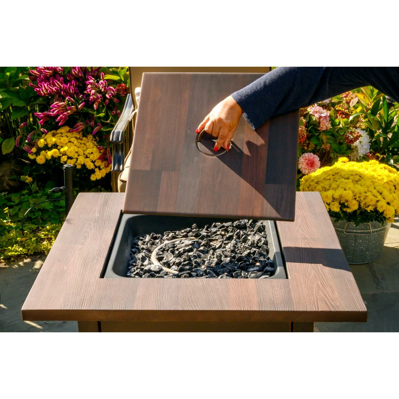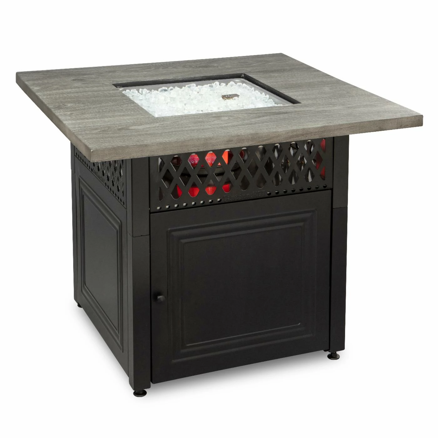 - Includes white fire glass, cover and table insert