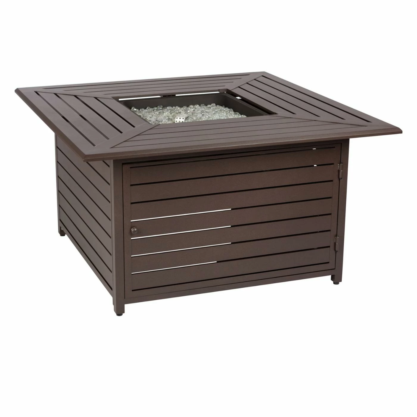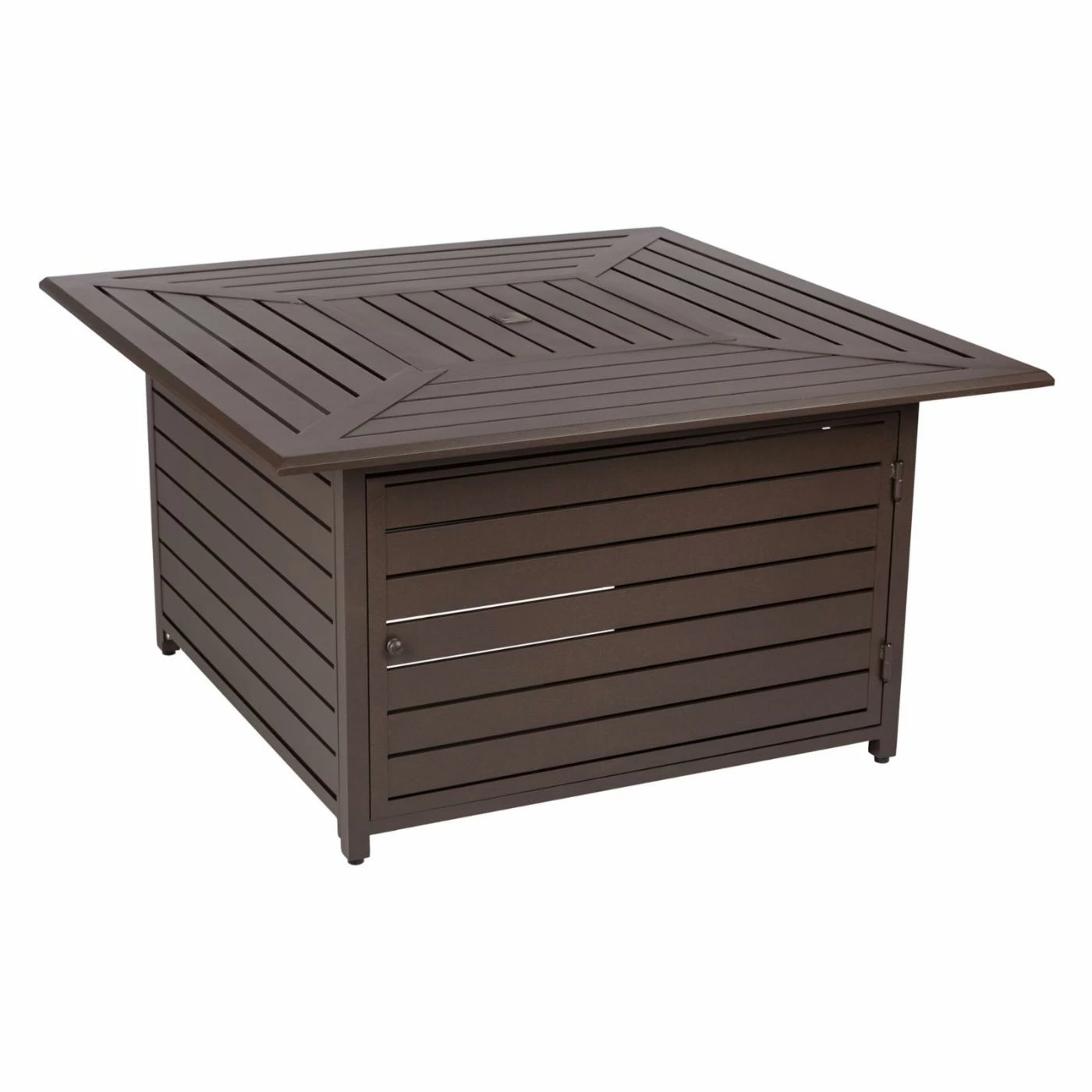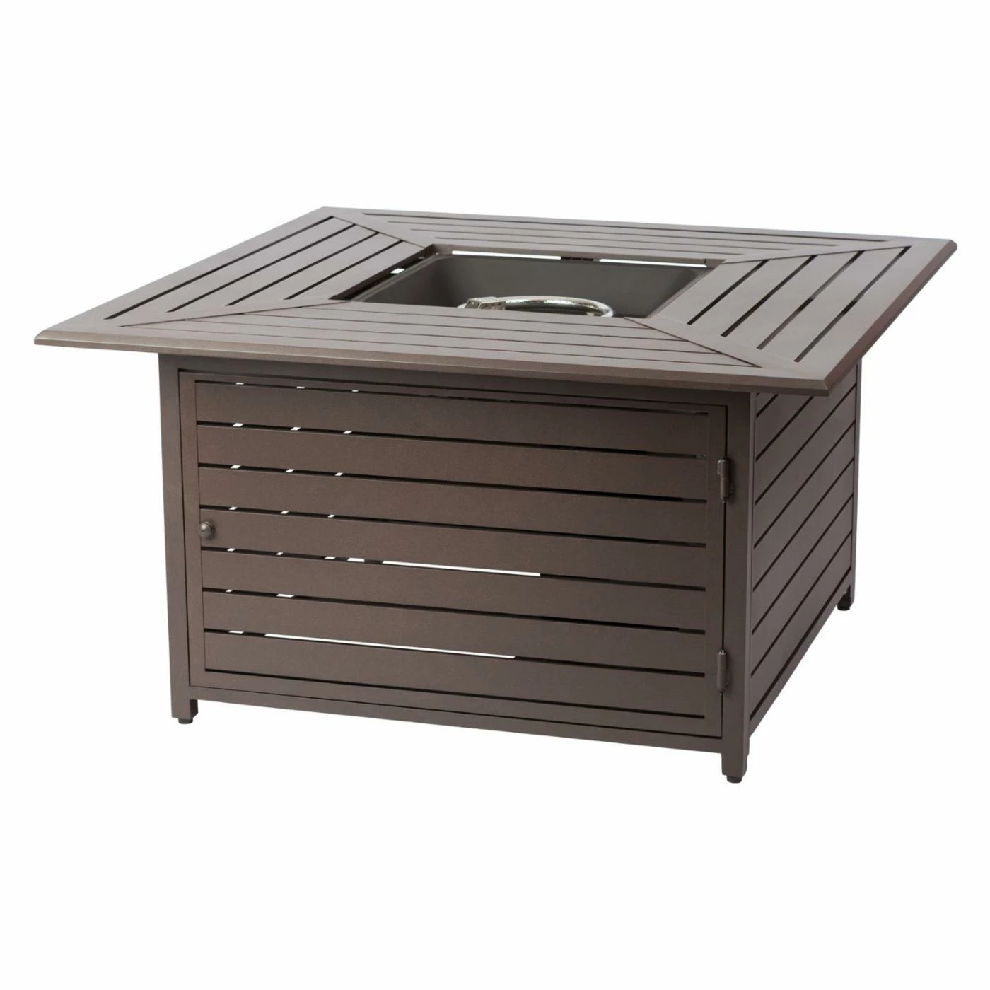 Add a multifunctional accent to your patio with the Fire Sense Danang 45 in. Fire Table. This fire pit table is constructed of aluminum with a stainless steel burner ring for durability. It is covered in a mocha powder-coated finish to protect the material from outdoor conditions. With a 20-pound propane tank the fire pit will provide a 50,000 BTU output. The included fire bowl lid will switch up the design to create a solid patio table. The slatted design coordinates with nearly any existing dΓ©cor. For off-season storage, it also includes a vinyl cover.