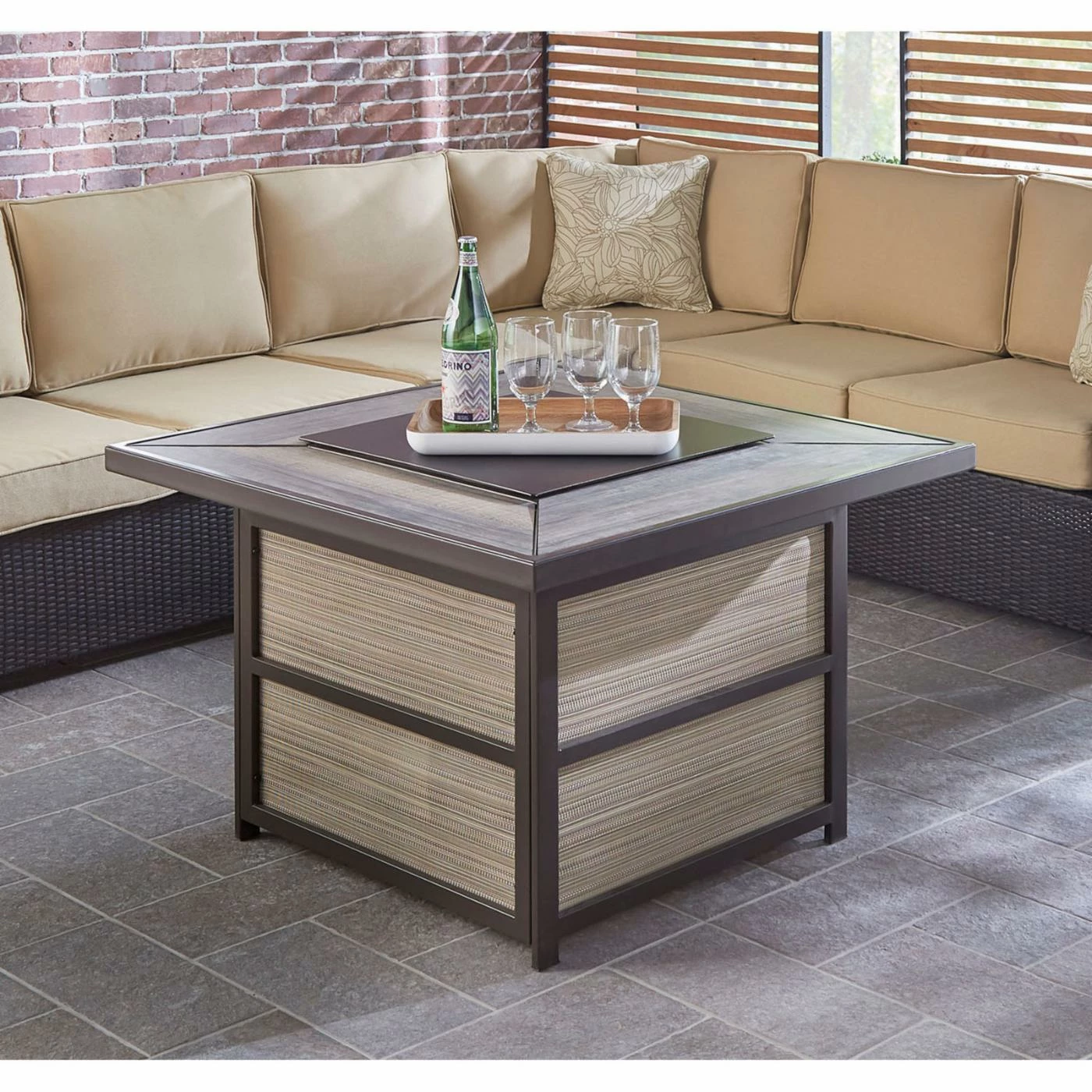 There’s a chill in the air, but you’re as cozy as can be with the Hanover Chateau 37.4 in. Fire Pit Coffee Table. This durable fire pit is constructed from rust-resistant aluminum with a neutral tan finish. Safe and easy to use, this fire pit table features a simple push-button ignition and adjustable heat settings. It uses a standard propane tank for fuel (not included). A concealed tank chamber is conveniently located within the base of the table. This square fire pit doubles as a coffee table and includes a lid to cover the burner when not in use. The burner emits up to 40,000 BTUs of heat and offers up to a 15-foot radius of warmth for those chilly evenings.