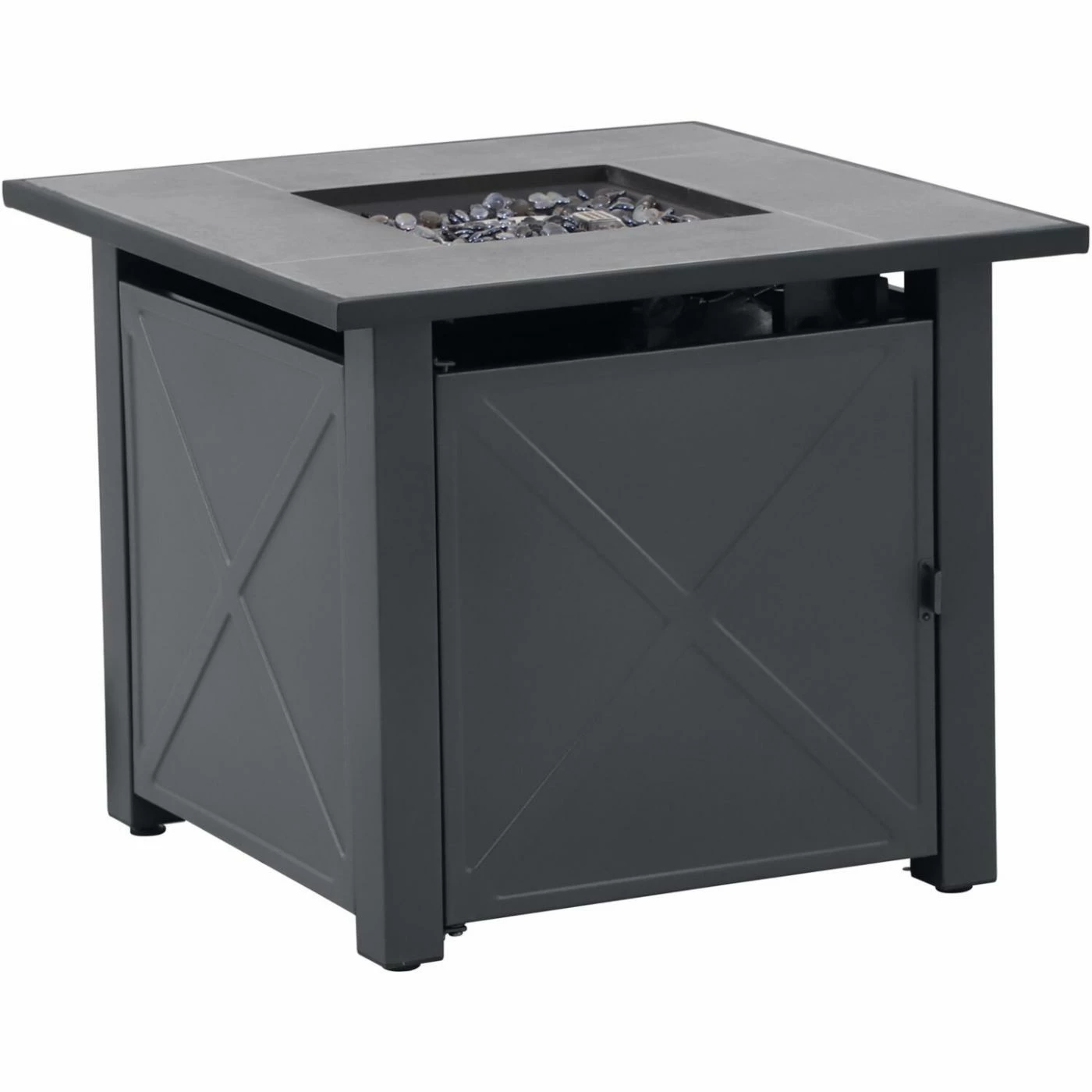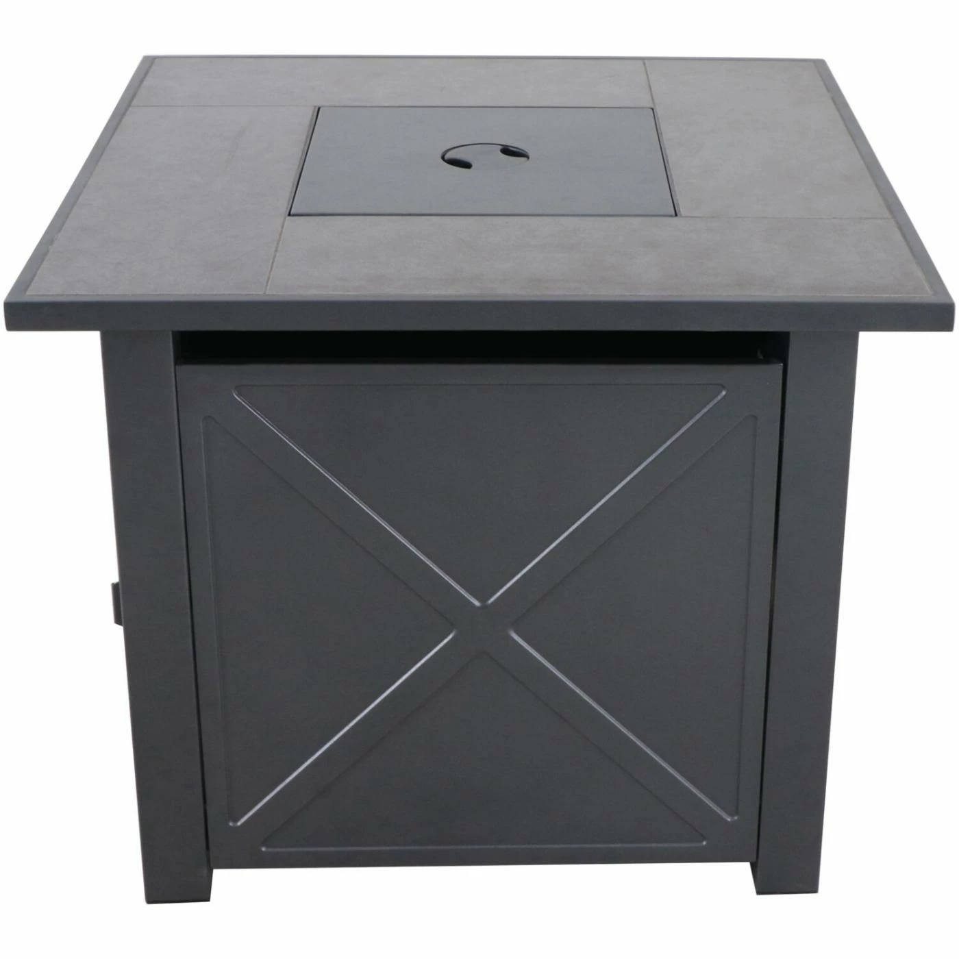 Your evening is going to be lit, quite literally, with the Mod Furniture Harper Tile-Top Gas Fire Pit Table. Entertain friends and loved ones by the cozy glow of a fire, without having to chop a single piece of firewood. The compact and clean gas fire pit is easy to use with push-button ignition and flame control, while its fuel tank is neatly concealed within the durable powder-coated steel frame, and accessible through a convenient access door. The fire pit is an outdoor asset day or nightβthe ceramic tile tabletop surrounding the burner pan doubles as a modern coffee table. When not illuminating your outside oasis, cover the burner with the included lid for added surface space. Created with all-weather materials, your backyard will be the neighborhood hot spot for years to come.