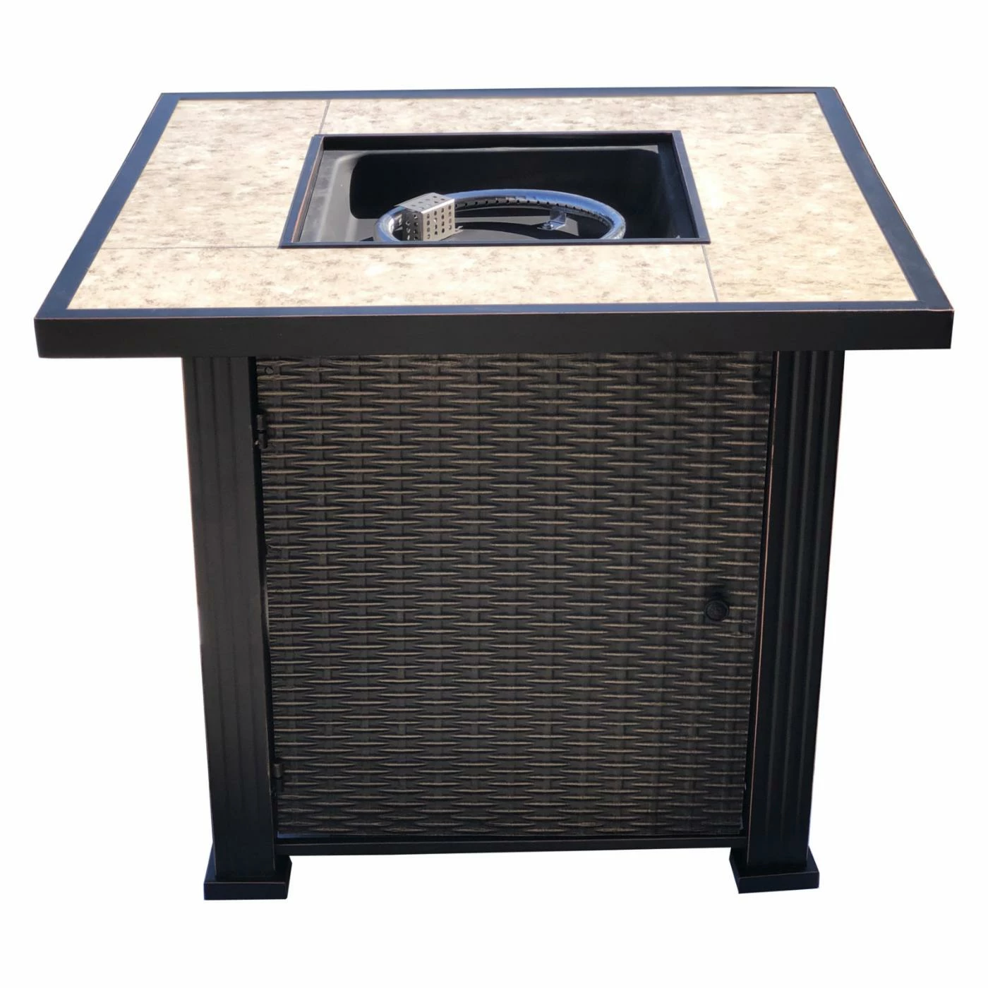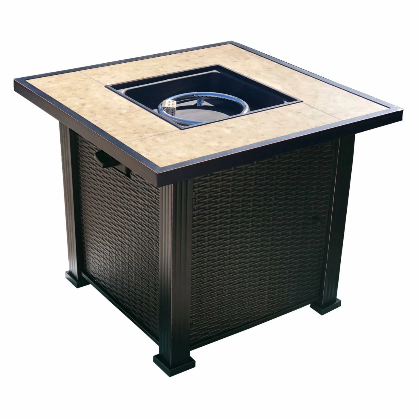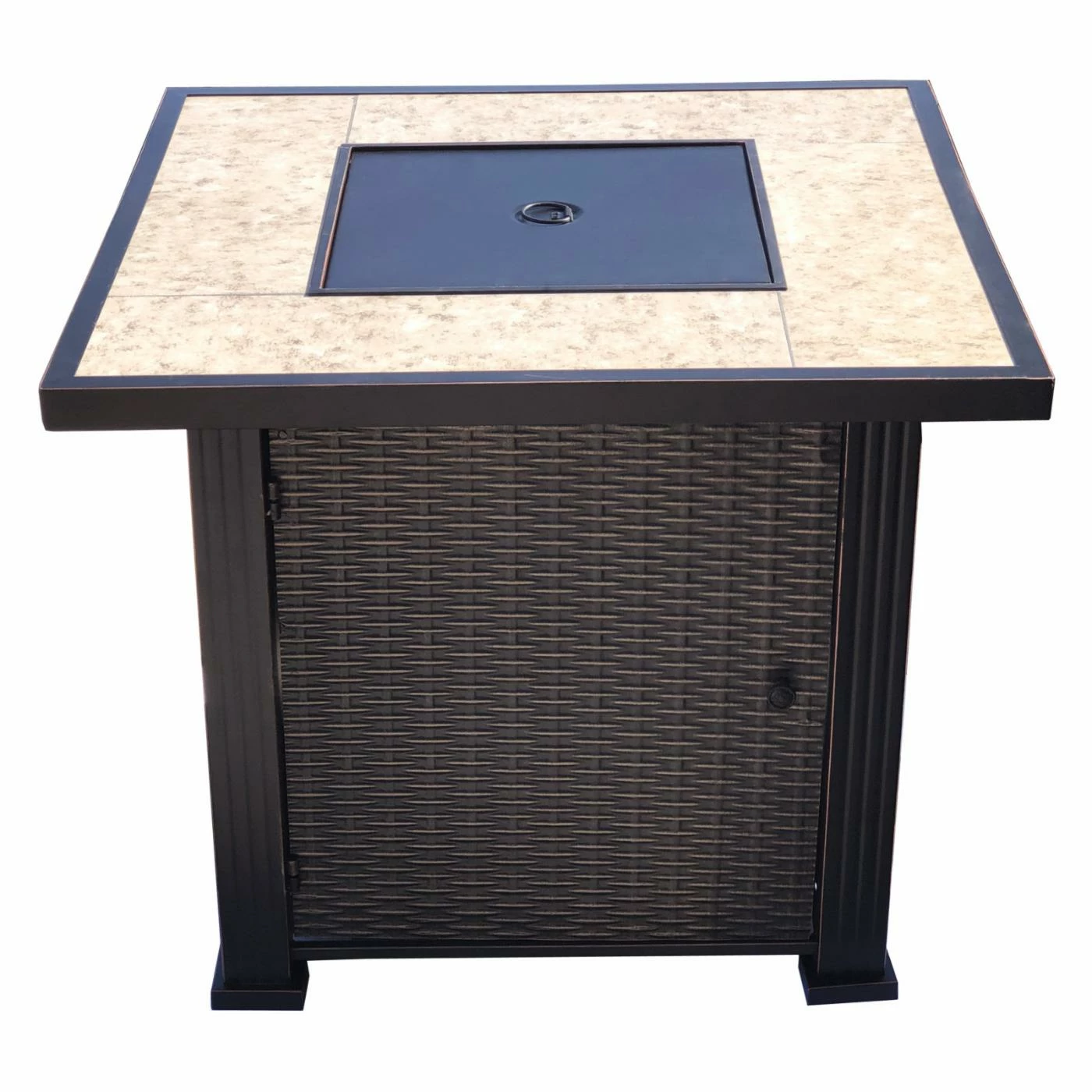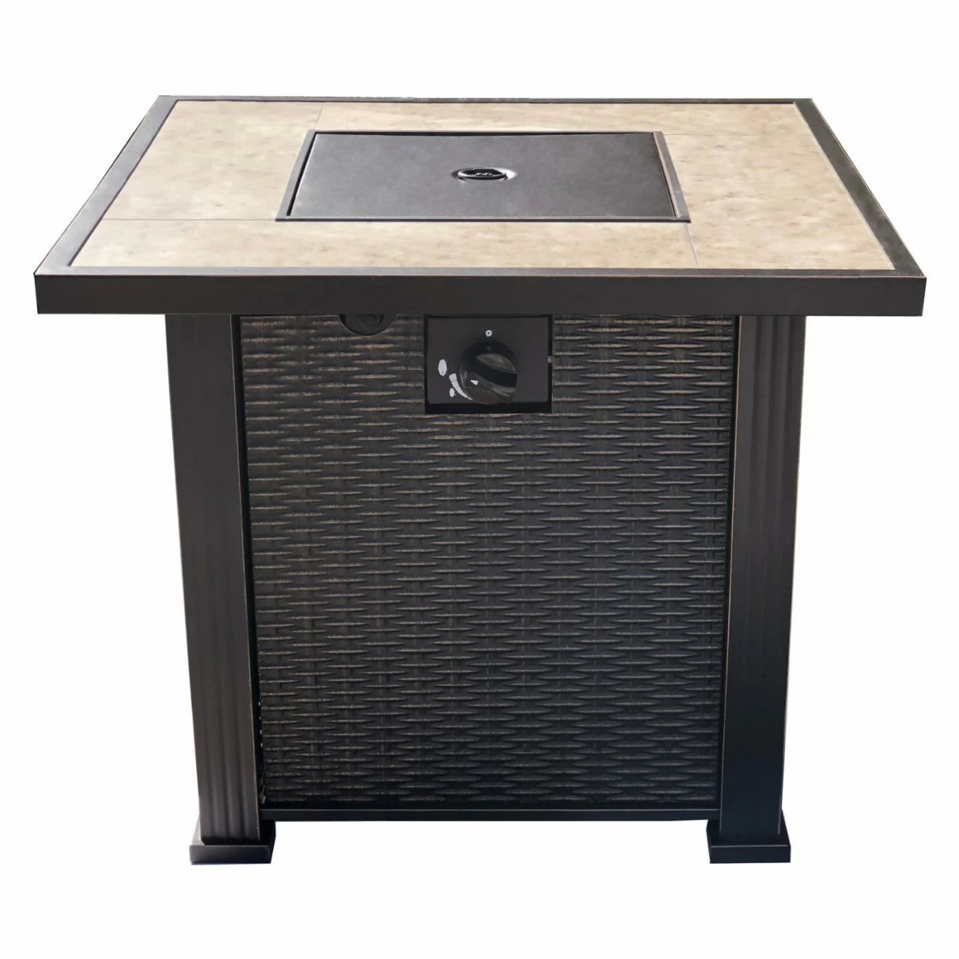 Extend your summer into fall and beyond winter with this modern design steel fire pit table. The SummervilleΒ Montey 30 in. Gas Fire Pit Table will make your guests naturally gather around the alluring fire pit table and enjoy the warm ambiance that it creates. Constructed of steel frame, the Montey Fire Pit conveniently hides the propane inside the base. The Fire pit top is made of porcelain tile which adds a touch of elegance to your outdoor area. The Montey operates at a maximum of 50,000 BTUs, offering warmth and a beautiful view. The fire pit table provides great flame distribution for a beautiful outdoor experience, while the natural lava rocks handsomely accent the flames, enhancing your surroundings. Also, the liquid propane provides a clean, smokeless burn with plenty of heat, so you can sit by the fire and enjoy the warm outdoors without worrying about smoke or ashes. The table insert transforms the pit into a table when not in use for extra space for refreshments while you and your guest are still enjoying the outdoors. With the Golden Bronze striped steel frame and a gray porcelain tile, this fire pit easily blends in with any dΓ©cor.Β When you buy this Montey Fire Pit Table, you are buying industry-leading quality, safety, and design.