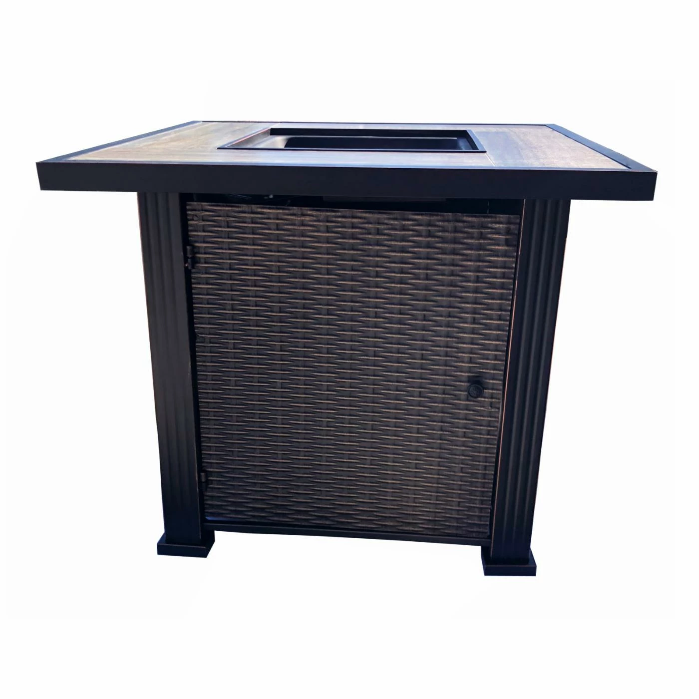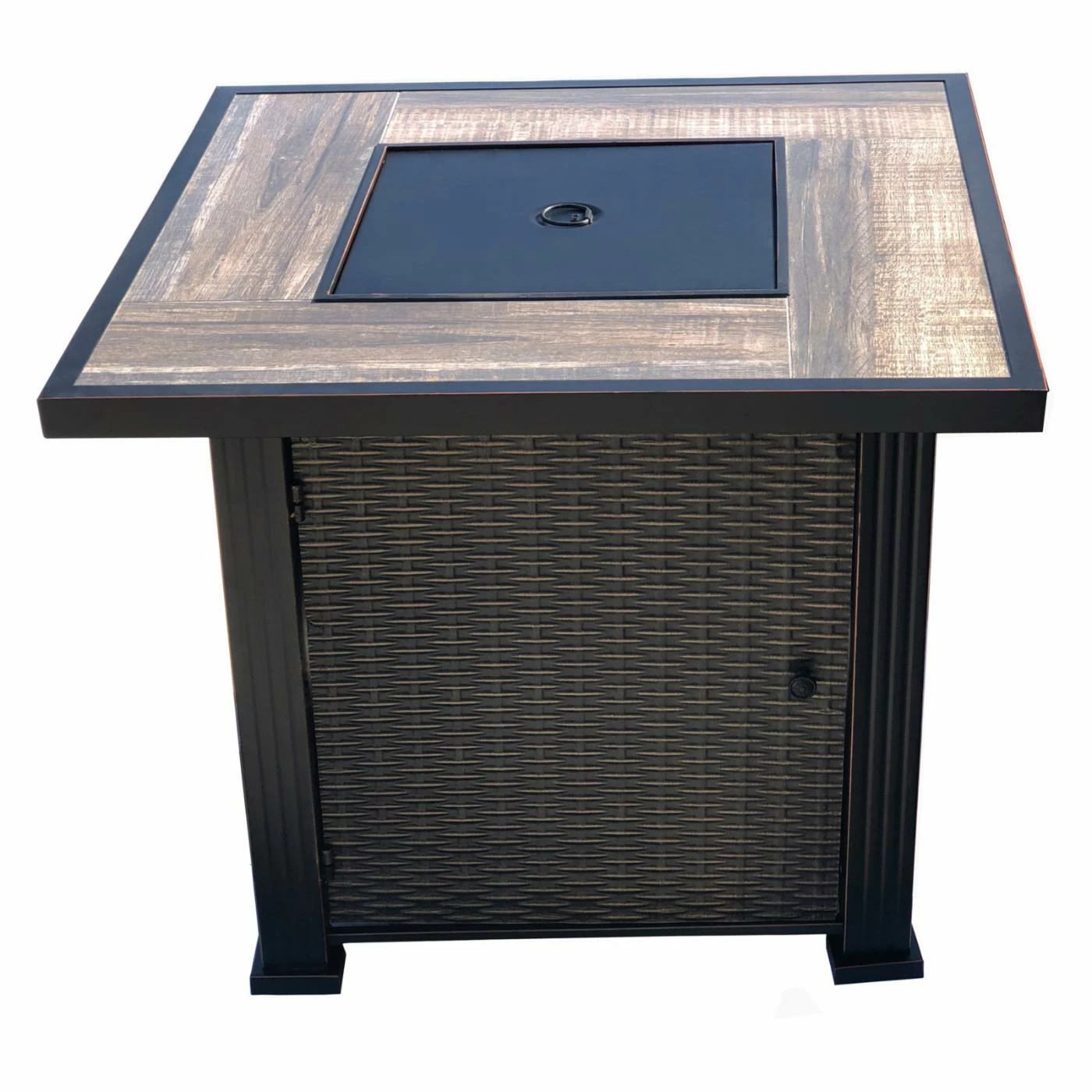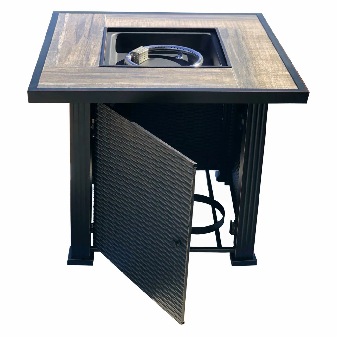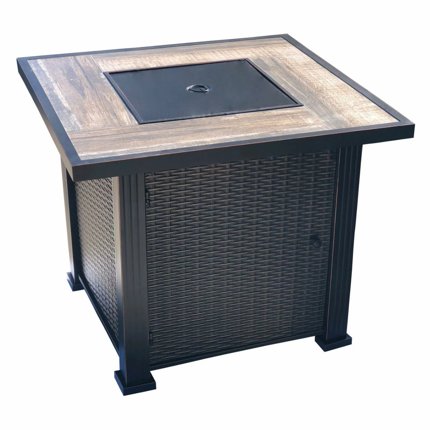 Extend your summer into fall and beyond winter with this modern design steel fire pit table. The SummervilleΒ Montey 30 in. Gas Fire Pit Table will make your guests naturally gather around the alluring fire pit table and enjoy the warm ambiance that it creates. Constructed of steel frame, the Montey Fire Pit conveniently hides the propane inside the base. The Fire pit top is made of porcelain tile which adds a touch of elegance to your outdoor area. The Montey operates at a maximum of 50,000 BTUs, offering warmth and a beautiful view. The fire pit table provides great flame distribution for a beautiful outdoor experience, while the natural lava rocks handsomely accent the flames, enhancing your surroundings. Also, the liquid propane provides a clean, smokeless burn with plenty of heat, so you can sit by the fire and enjoy the warm outdoors without worrying about smoke or ashes. The table insert transforms the pit into a table when not in use for extra space for refreshments while you and your guest are still enjoying the outdoors. With the Golden Bronze striped steel frame and a gray porcelain tile, this fire pit easily blends in with any dΓ©cor.Β When you buy this Montey Fire Pit Table, you are buying industry-leading quality, safety, and design.