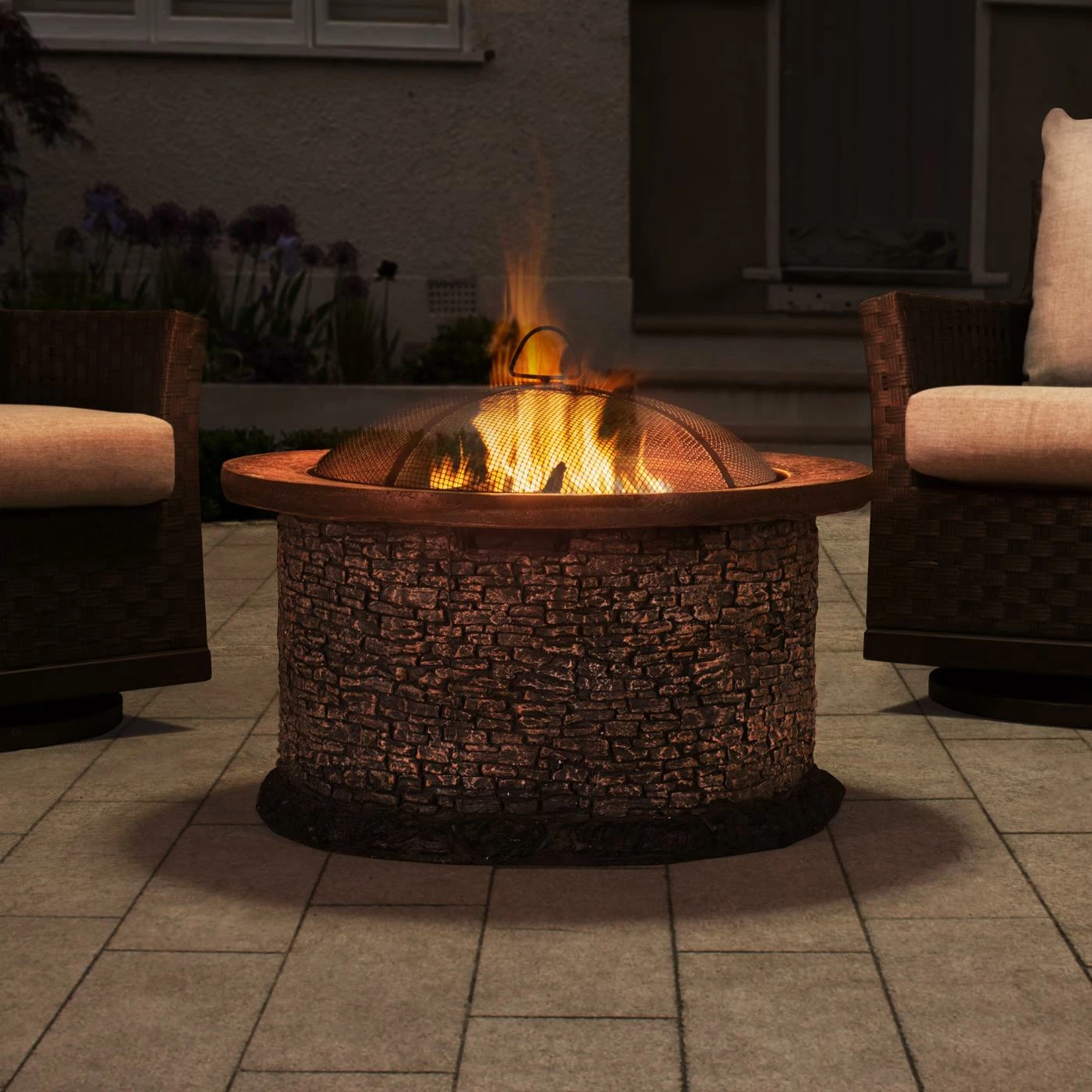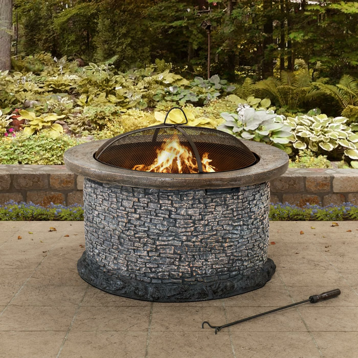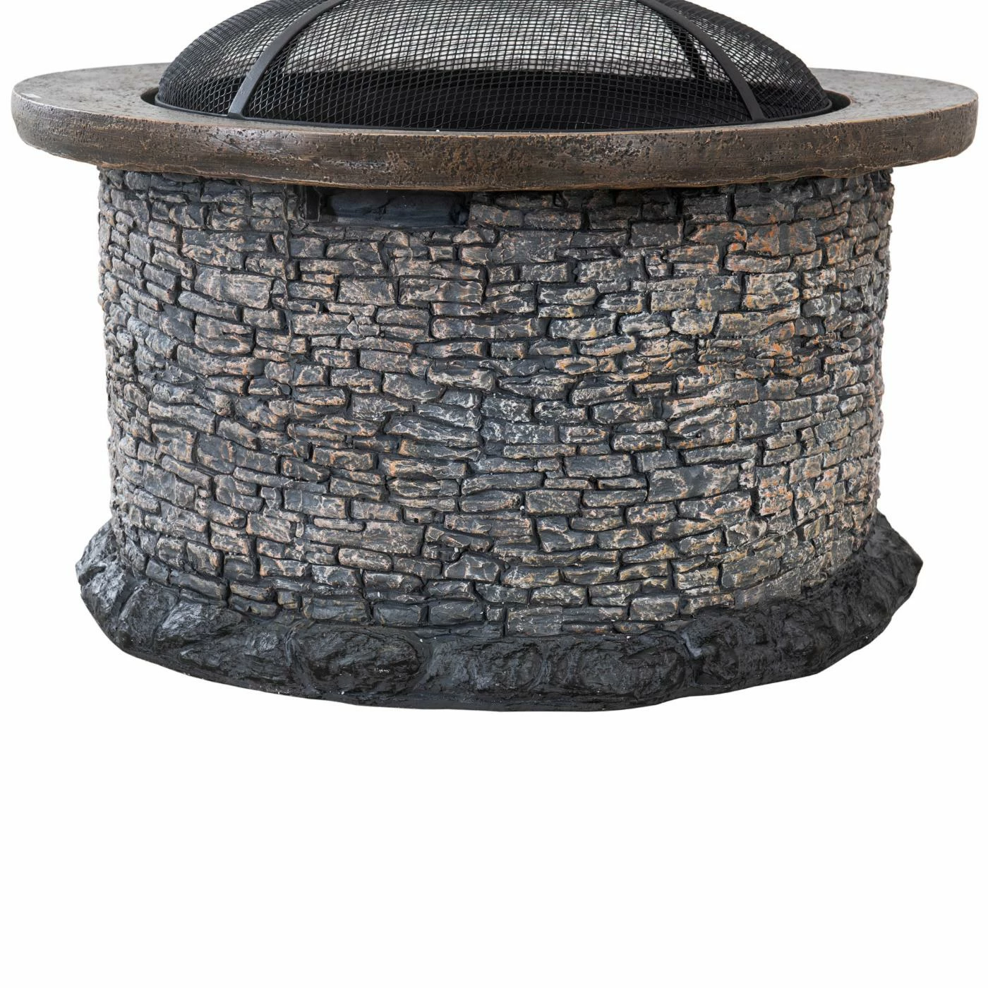 Whether roasting marshmallows, enjoying a glass of wine or just swapping stories under the stars, this outdoor wood-burning firepit transforms your backyard into a relaxation destination. Made from manufactured stone and powder-coated steel the firepit enables you to build a large warm fire. Surrounded by manufactured stone firepit looks like a custom built-in piece, but itโs lightweight enough to easily move around. A fire poker and a mesh screen to catch embers and sparks are included. Gather friends and family and enjoy time outdoors even more with this firepit from Sunjoy, the worldโs leading ready-to-assemble outdoor structure maker.
