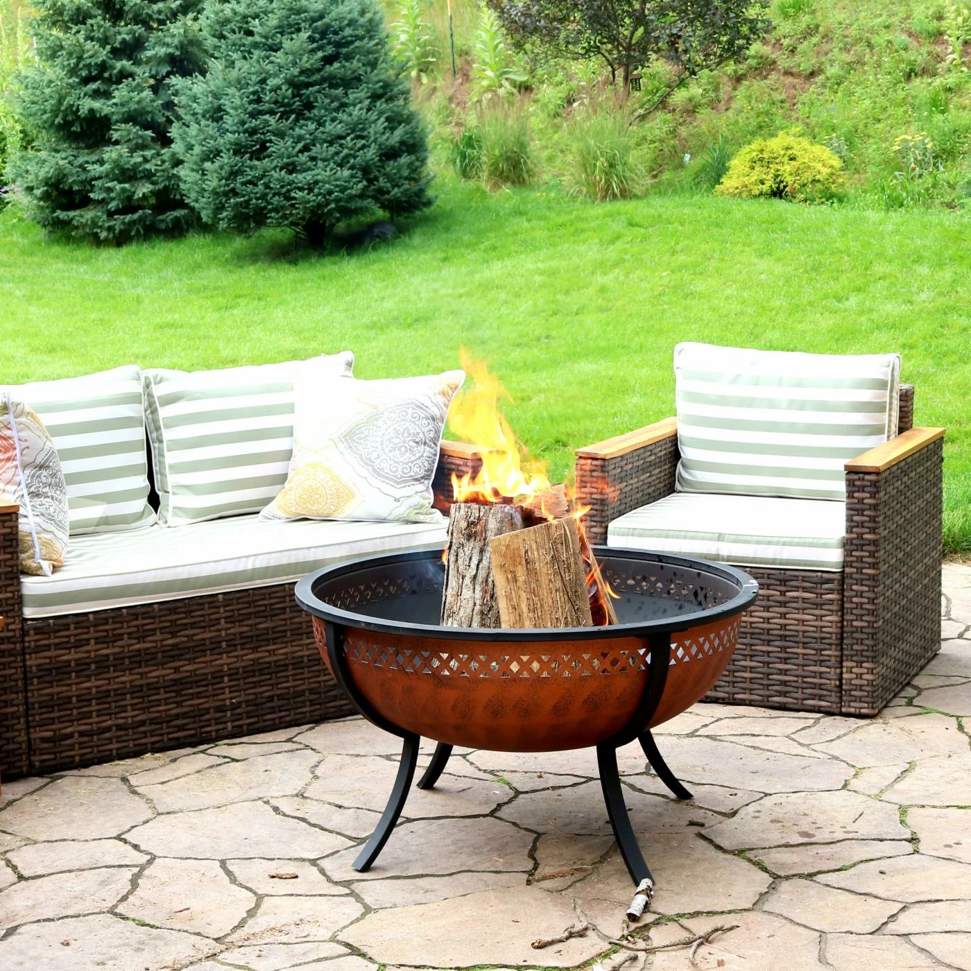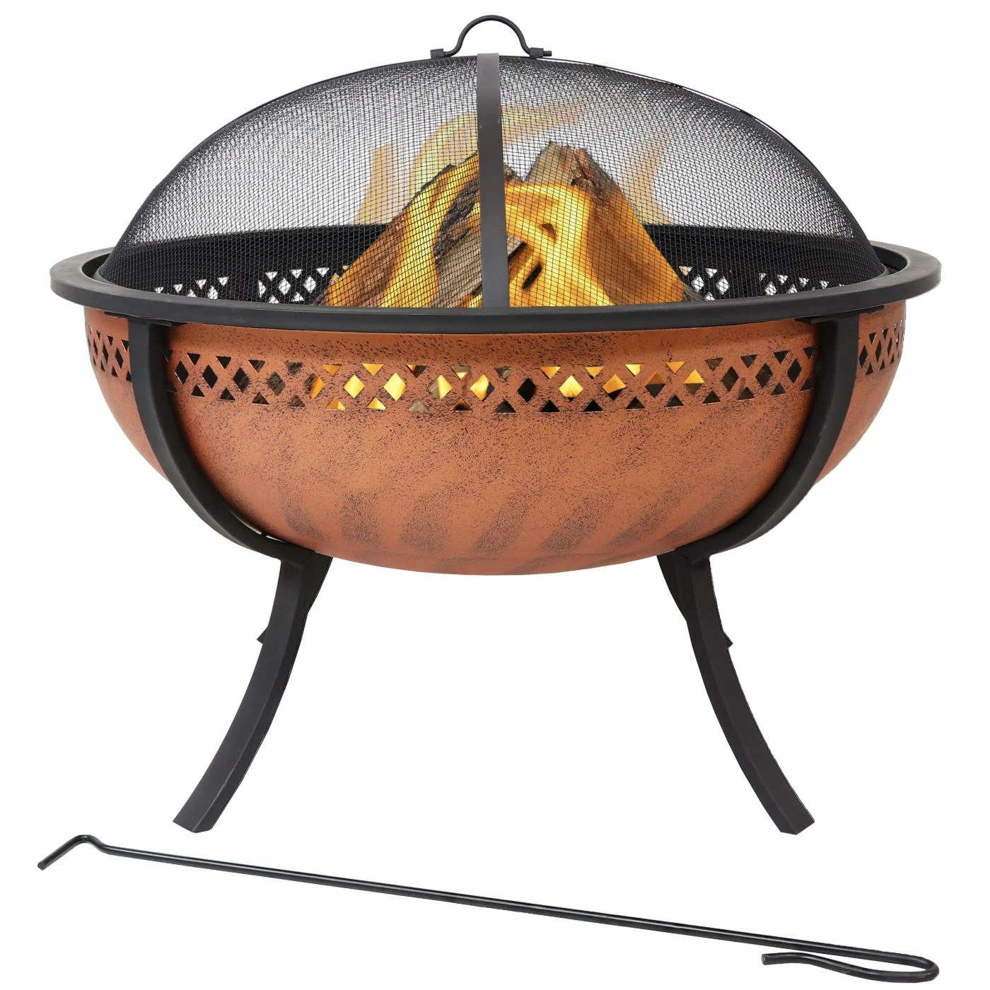 Enjoy the warmth and ambiance of a wood-burning fire on a cool evening with this steel outdoor fire pit. This exterior fire feature has an attractive crossweave cutout along the border of the fire bowl that adds a subtle, yet decorative touch. It is durably constructed of steel with a beautiful copper finish to brighten your outdoor space. This fire pit includes everything needed to build and maintain a well-burning fire, including 1 fire pit, 1 spark screen, 1 fire poker and 1 log grate.